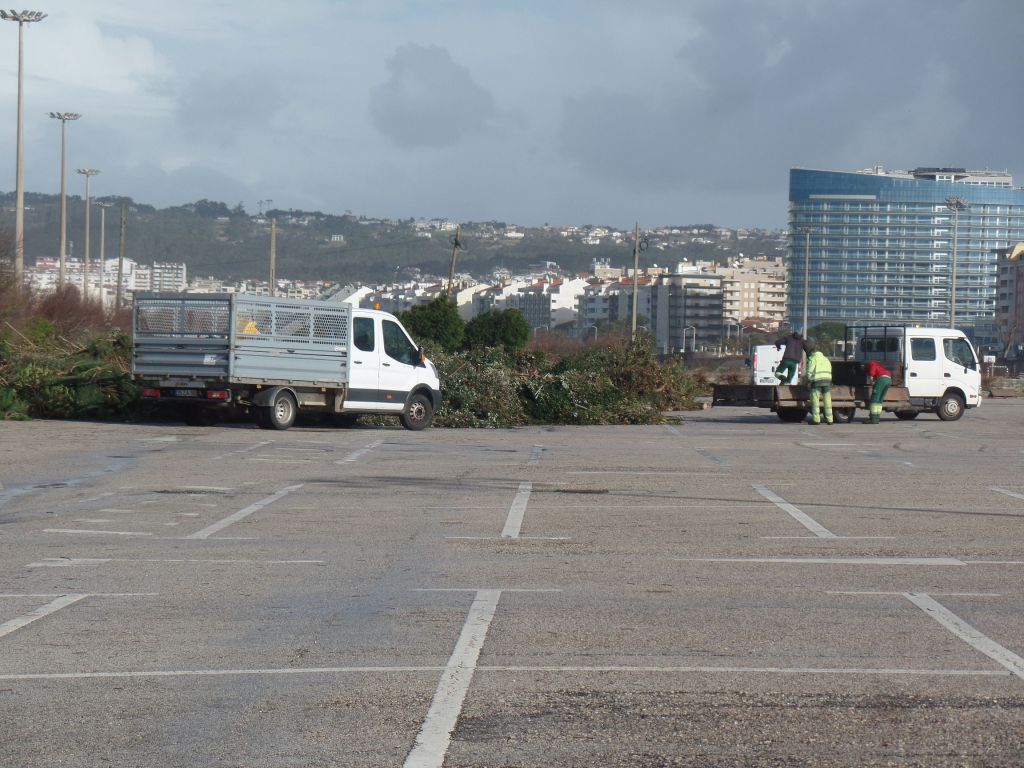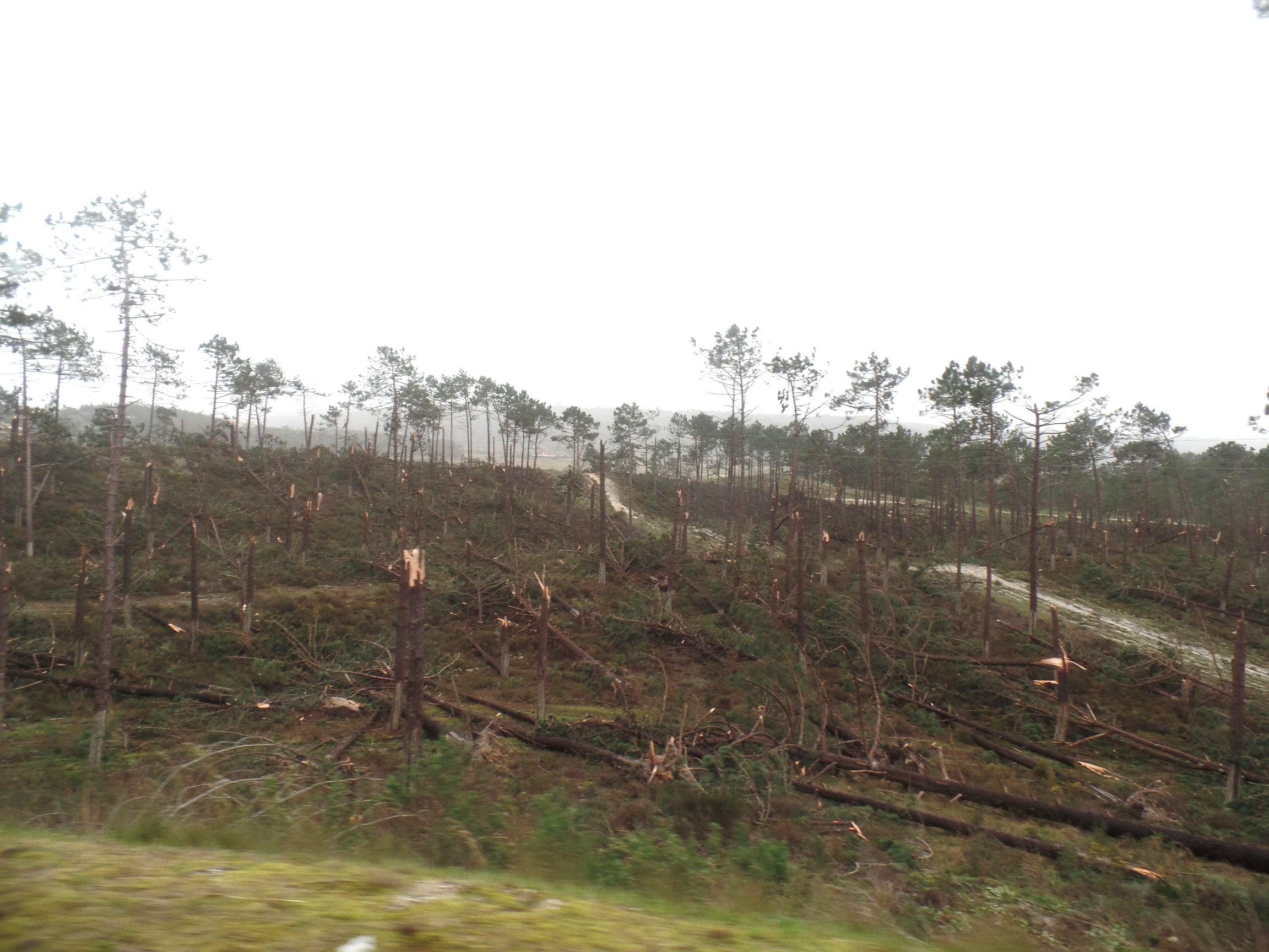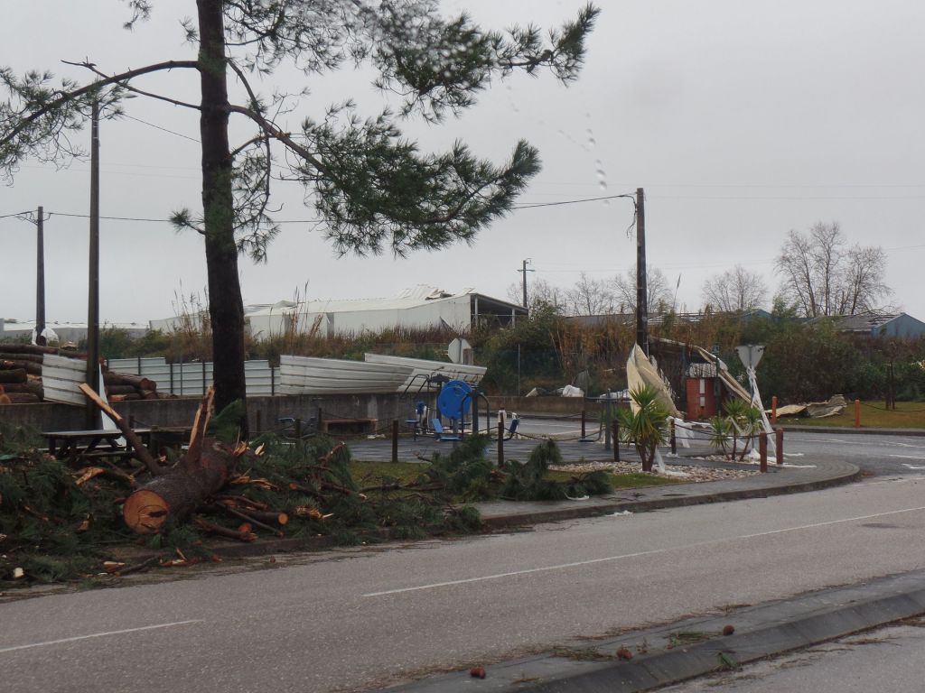 Das Zentrum des Sturmes „Kristin“ zog direkt durch die Landschaft, durch die wir von Batalha nach Figueira da Foz fuhren. Entsprechend schlimm sieht es überall aus. Schneisen der Verwüstung wohin man sieht. Abgedeckte Dächer, sämtliche Werbetafeln sind zerstört, direkt knapp über dem Boden abgeknickt, die Hälfte der Verkehrsschilder wurde umgeknickt, der halbe Wald existiert nicht mehr. Die Bäume, zumeist Kiefern, knickten wie Streichhölzer in der Mitte ab. Viele Bäume wurden aus der Erde gerissen. Es gibt nur wenige Häuser, die nicht in Mitleidenschaft gezogen wurden. Nicht ist mehr wie es war.