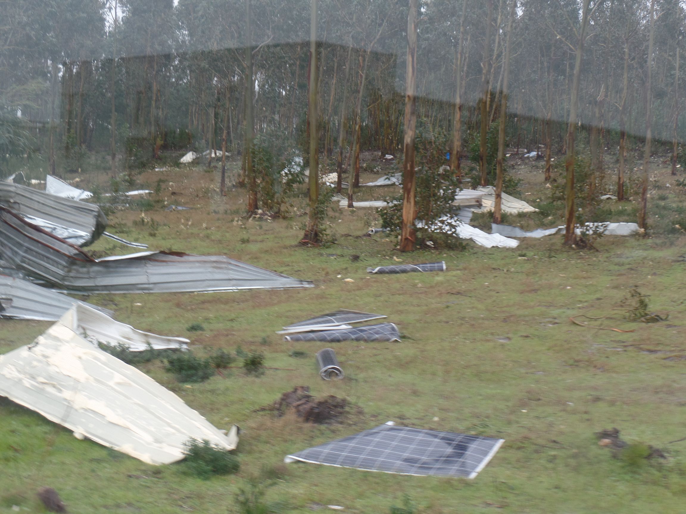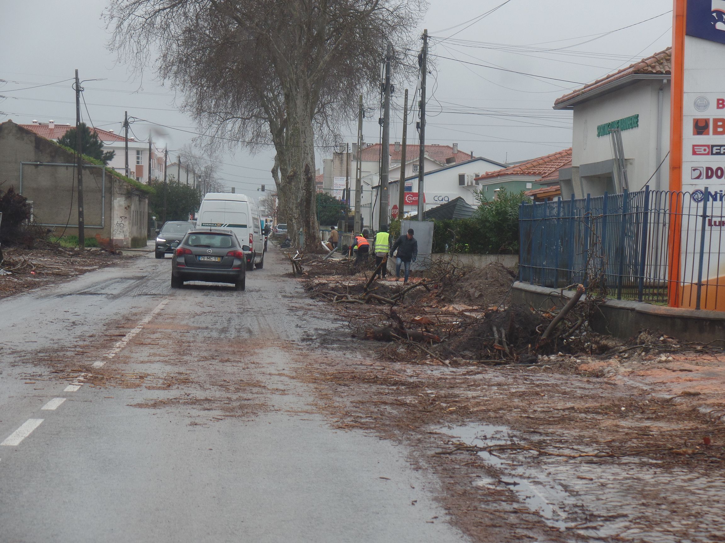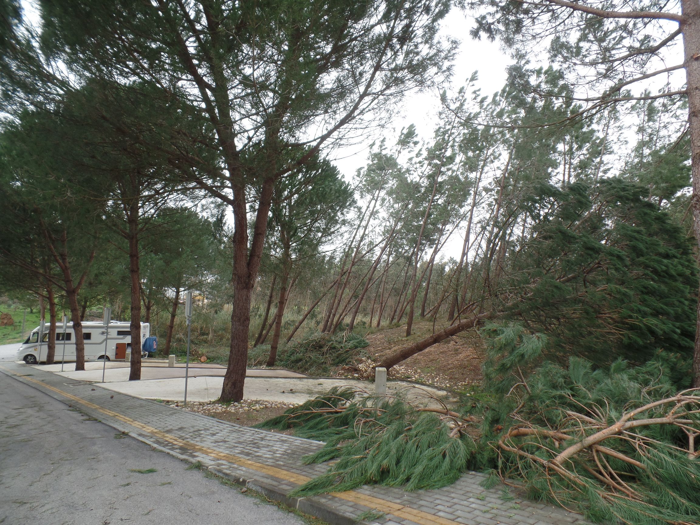 Das Zentrum des Sturmes „Kristin“ zog direkt durch die Landschaft, durch die wir von Batalha nach Figueira da Foz fuhren. Entsprechend schlimm sieht es überall aus. Schneisen der Verwüstung wohin man sieht. Abgedeckte Dächer, sämtliche Werbetafeln sind zerstört, direkt knapp über dem Boden abgeknickt, die Hälfte der Verkehrsschilder wurde umgeknickt, der halbe Wald existiert nicht mehr. Die Bäume, zumeist Kiefern, knickten wie Streichhölzer in der Mitte ab. Viele Bäume wurden aus der Erde gerissen. Es gibt nur wenige Häuser, die nicht in Mitleidenschaft gezogen wurden. Nicht ist mehr wie es war.