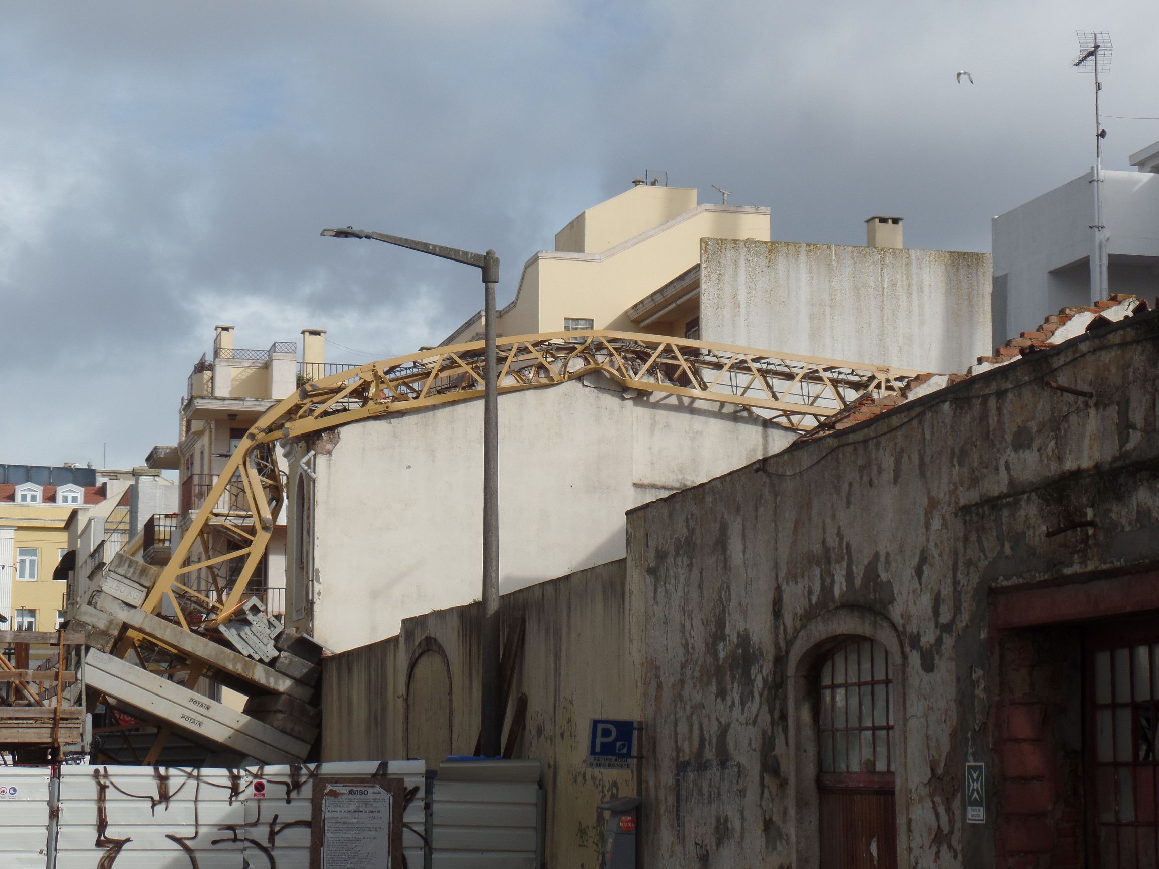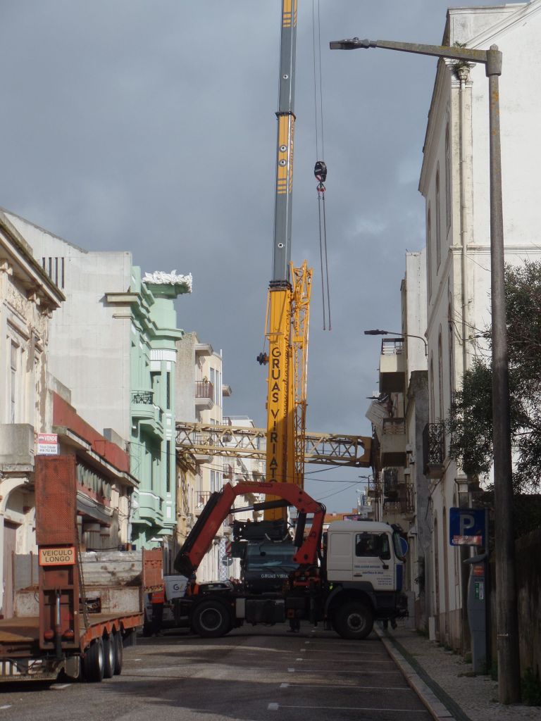 Wir spazierten die Straße am Hafen entlang und kamen zu einer schmalen Querstraße. Dort war man gerade dabei eines der alten Häuser zu rekonstruieren. Der Sturm „Kristin“ warf jedoch den Baukran um, der sich um eines der Häuser wickelte. Das obere Ende des Kranes hing quer über die nächste Querstraße. Mit Hilfe eines anderen Kranes versuchte man den havarierten Kran zu bergen. Dabei war die Presse anwesend, um dieses Ereignis zu dokumentieren. Langsam kommen wir uns wie Katastrophen-Touristen vor. Portugal ist wirklich schwer getroffen.