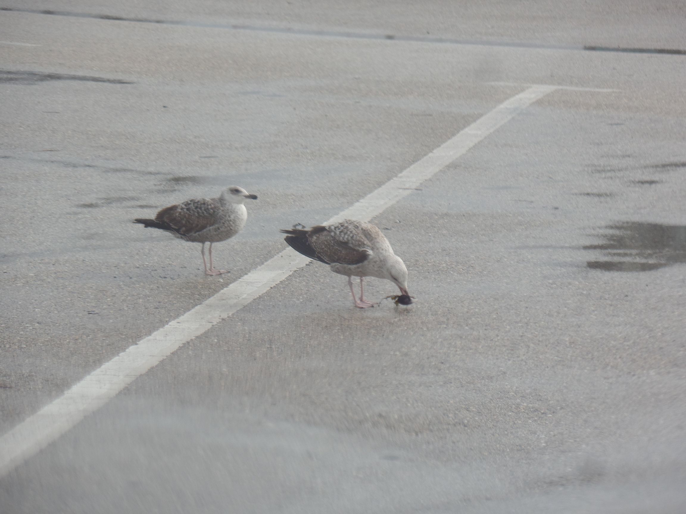 Wegen der vielen Regengüsse verbrachten wir viel Zeit im Wohnmobil. Dabei konnten wir Möwen beobachten, die sich frische Miesmuscheln aus dem Wasser holten. Sie brachten sie zum Parkplatz, ließen sie aus einiger Höhe fallen und kamen so leicht an das Muschelfleisch heran.
