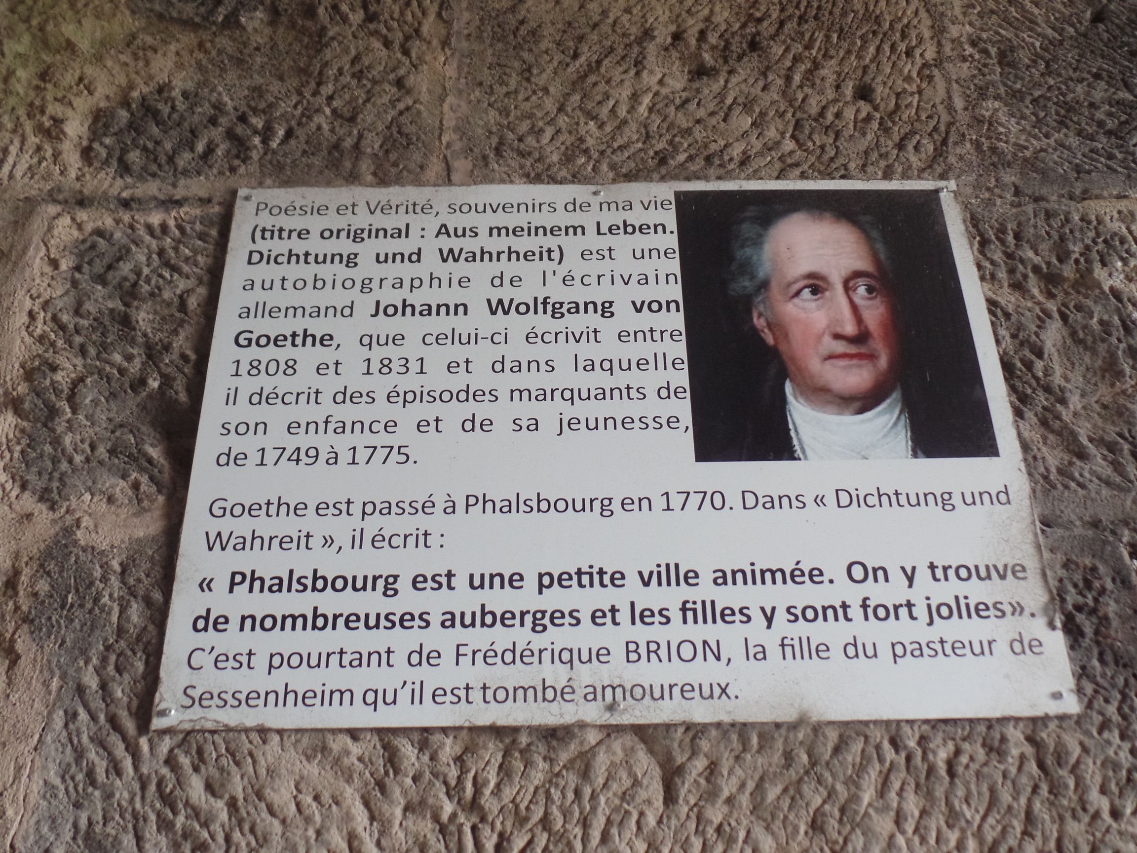 Am linken Torrand der Außenseite ist eine kleine Tafel angebracht, die an den Besuch Goethes am 23. Juni 1770 in Pfalzburg erinnert. In dem Werk „Dichtung und Wahrheit“, welches eine Autobiografie Goethes ist, schrieb er auch über seinen Besuch in Phalsbourg. Er schrieb: „Phalsbourg ist ein lebhaftes Städtchen. Es gibt dort viele Gasthäuser und die Mädchen sind sehr hübsch.“