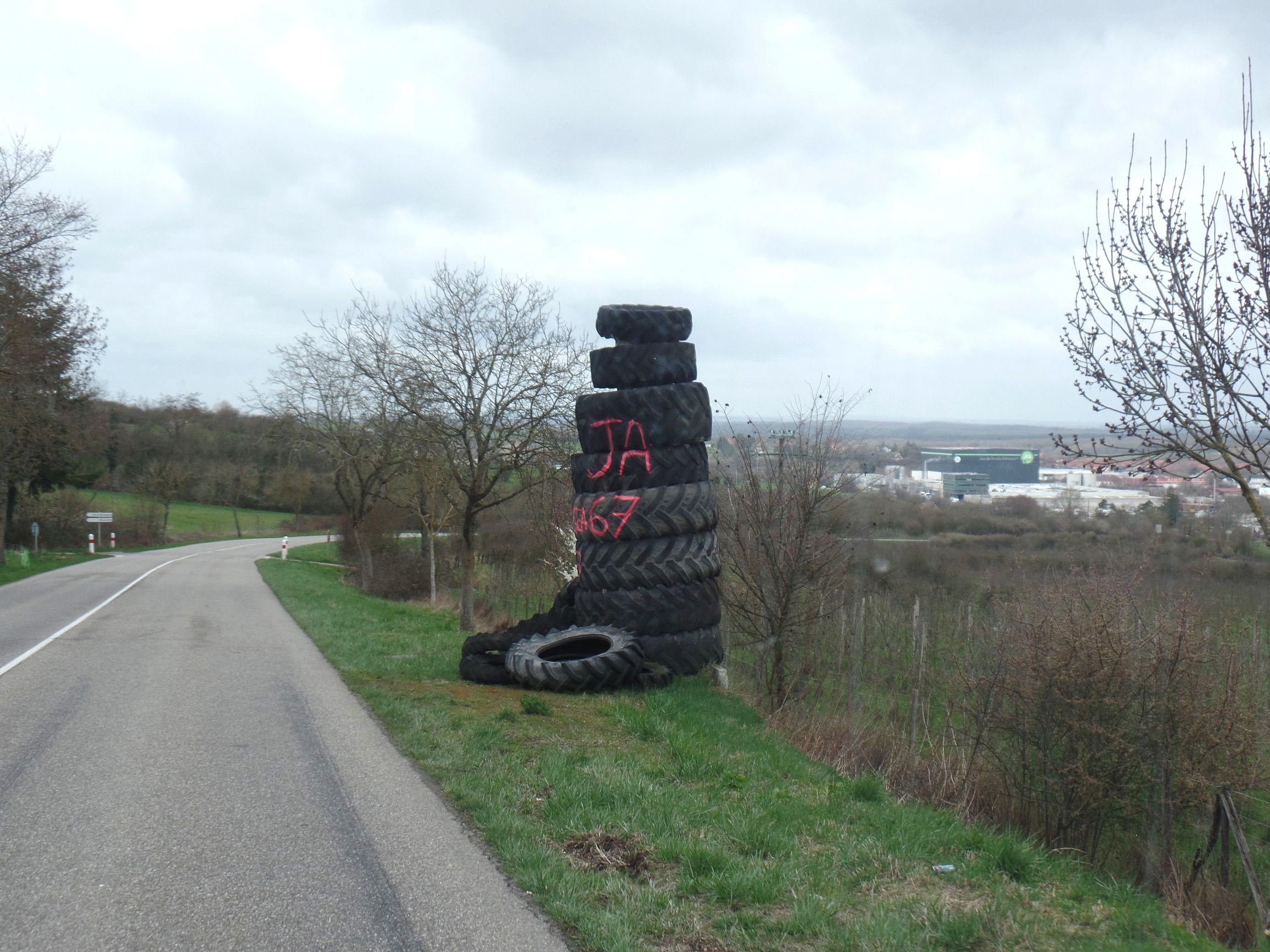 Auf dem Weg nach Güdingen trafen wir auf mehrere Blitzer, die allesamt als „Kunstwerke“ umfunktioniert wurden. Tarnung oder Abwehr, das ist hier die Frage. Irgendjemand hat die Blitzer mit großen Traktorreifen verkleidet. Manche können nicht mehr blitzen, andere wohl schon, denn die Kameras liegen frei. Kaum zu glauben, dass die französische Polizei die Blitzer nicht wieder freilegt. Es ist wohl doch eine Protestaktion der Franzosen, denn andere Blitzer waren zugesprüht oder auch umgestoßen.