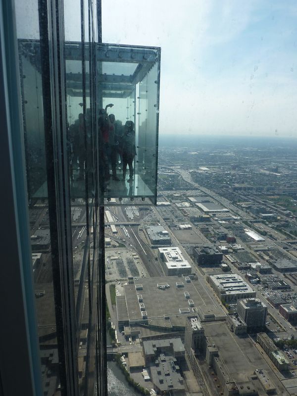 Das Aufregendste war das Skydeck im 103. Stock des Willis Towers, von wo aus man einen 360°-Blick auf Chicago und seine Umgebung hat. An der Nordseite des Towers sind 4 gläserne Erker, inklusive gläsernem Fußboden angebracht. Dort drinnen steht man 412 m über der Straße. Das ist so hoch, dass man kaum die Menschen erkennt, die Züge so klein wie Ameisenkolonnen sind. Selbst die Hochhäuser, die von unten riesig erscheinen, sind gegen den Willis Tower klein. Unglaublich. Nicht jeder hat den Mut, sich auf diese gläsernen Konstruktionen einzulassen. Der Aufzug, der die Besucher nach oben bringt, braucht kaum eine Minute. Die Fahrt ist kaum zu merken, nur dass man durch den Höhenunterschied mehrmals einen Druckausgleich durchführen muss. Man sollte den Aufzug von außen sehen können. Ich glaube, dann würden viele Leute nicht mitfahren.