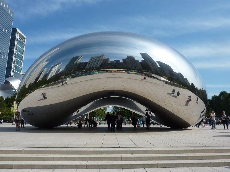 Chicago liegt direkt am Lake Michigan. Vor dem Stadtzentrum sind mehrere Parks angelegt. Im Millennium Park steht eine sogenannte „Wolke“ aus poliertem Edelstahl. Wie hat man die wohl hingekriegt? Die Rundungen sind perfekt und die Spiegelungen so zahlreich, dass man sich eine ganze Weile mit dem Kunstwerk beschäftigen kann.