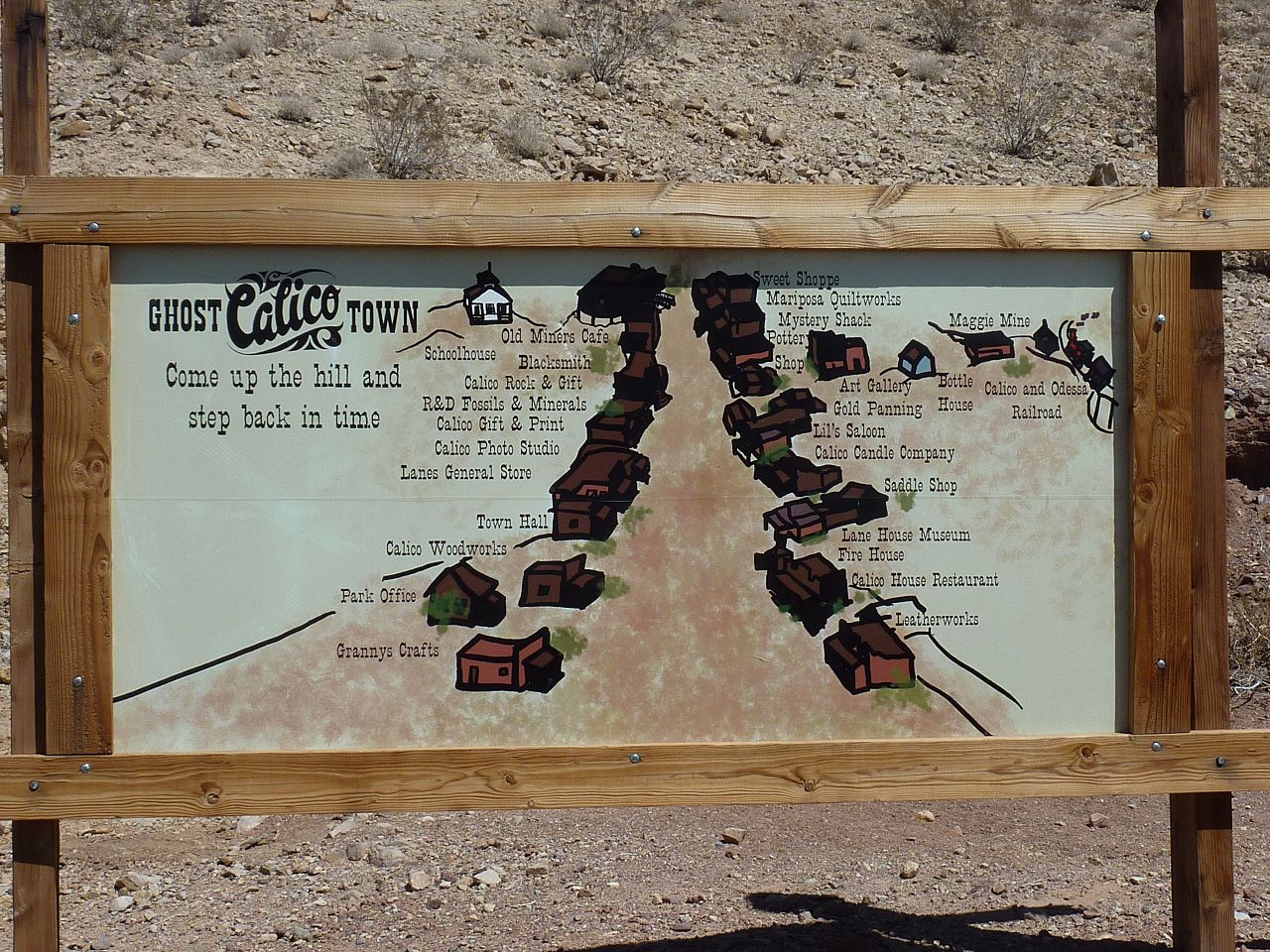 Geisterstadt Calico - ÜbersichtZur Geisterstadt Calico, die eigentlich keine Geisterstadt ist, denn Calico wurde für die Touristen neu aufgebaut und belebt, machten wir nur einen Abstecher. Da hier 7,-$ Eintritt pro Person verlangt wurden, kehrten wir um. Das ist nicht, was wir sehen wollen.