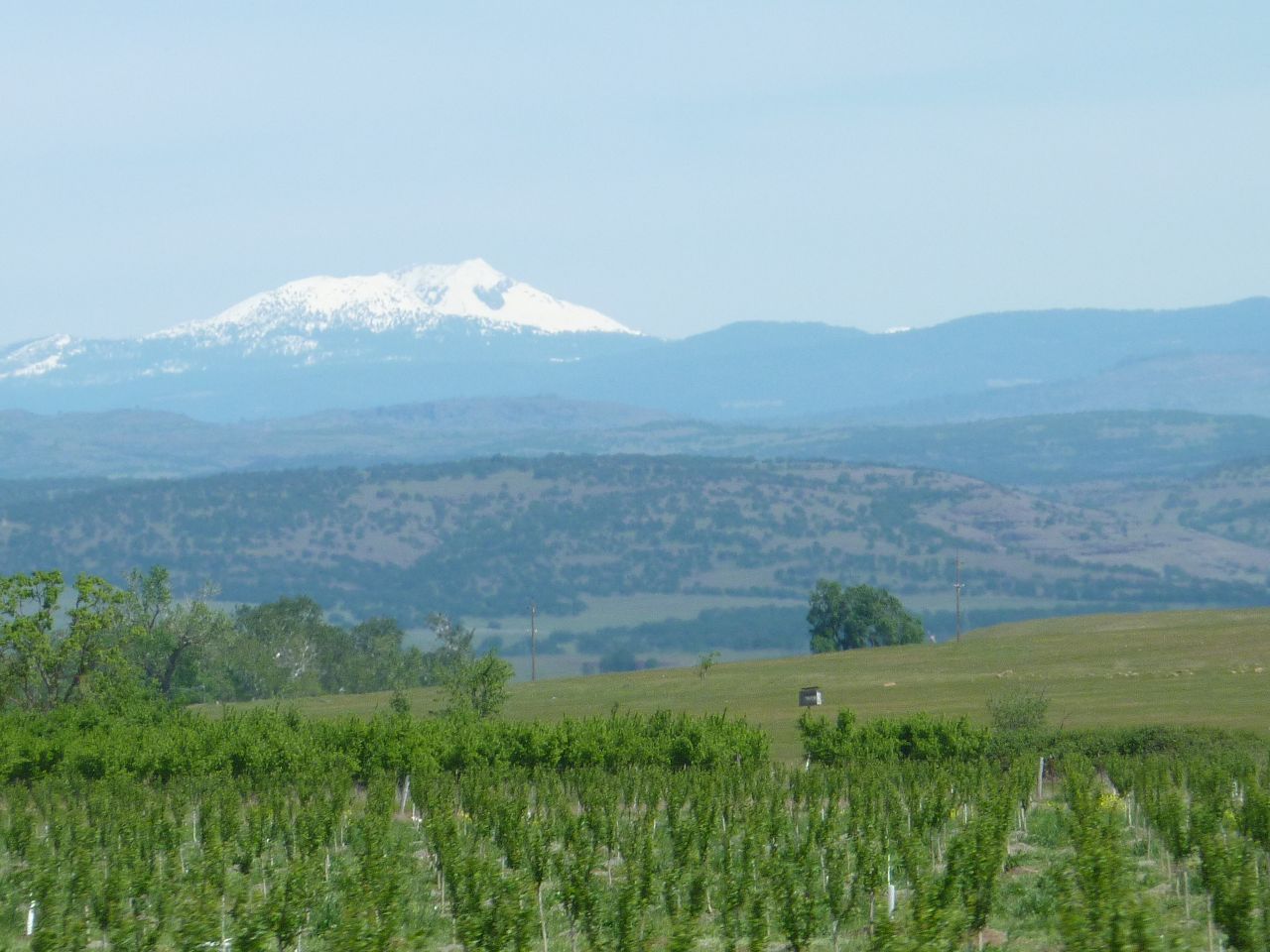 Eigentlich sollte die Tour jetzt über die nördliche Sierra Nevada zum Lake Tahoe gehen. Der Lake Tahoe ist der größte Bergsee Nordamerikas und liegt auf 1900m Höhe, mit Blick auf die schneebedeckten Berge der Sierra. Angesichts der letzten Tage ließen wir von diesem Vorhaben ab und fahren jetzt im Sacramento Valley weiter nach Norden. Die Temperaturen in den Bergen liegen nur noch um die 15°C, in den Höhenlagen sanken sie bis auf 2°C. Im Tal des Sacramento River setzen sich die Felder und Plantagen fort, nur dass jetzt die Walnussbäume, Unmengen davon, die Oberhand haben. Wein und Oliven sind seltener, die Erdbeerernte läuft. Das alles verbraucht unendlich viel Wasser, zu viel Wasser.