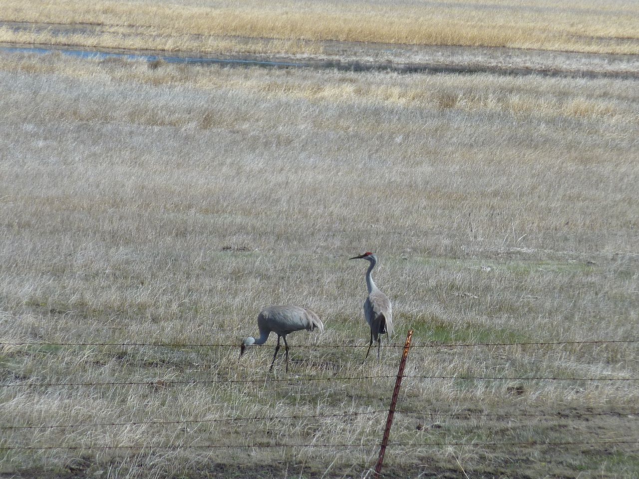 Ein Stück weiter erinnert eine Tafel an den Emigranten Trail ab 1852, der einige Jahre später vom Militär und dann von Goldsuchern genutzt wurde. Durch die Hochebene des Klamath National Forest, die Landschaft mutet inzwischen wie die Tundra an, erreichten wir auf ungefähr 4500 Fuß Höhe (gute 1300m) die Staatsgrenze zu Oregon. Kraniche, Gänse und Enten ließen sich am Straßenrand sehen, von Frühling keine Spur mehr.