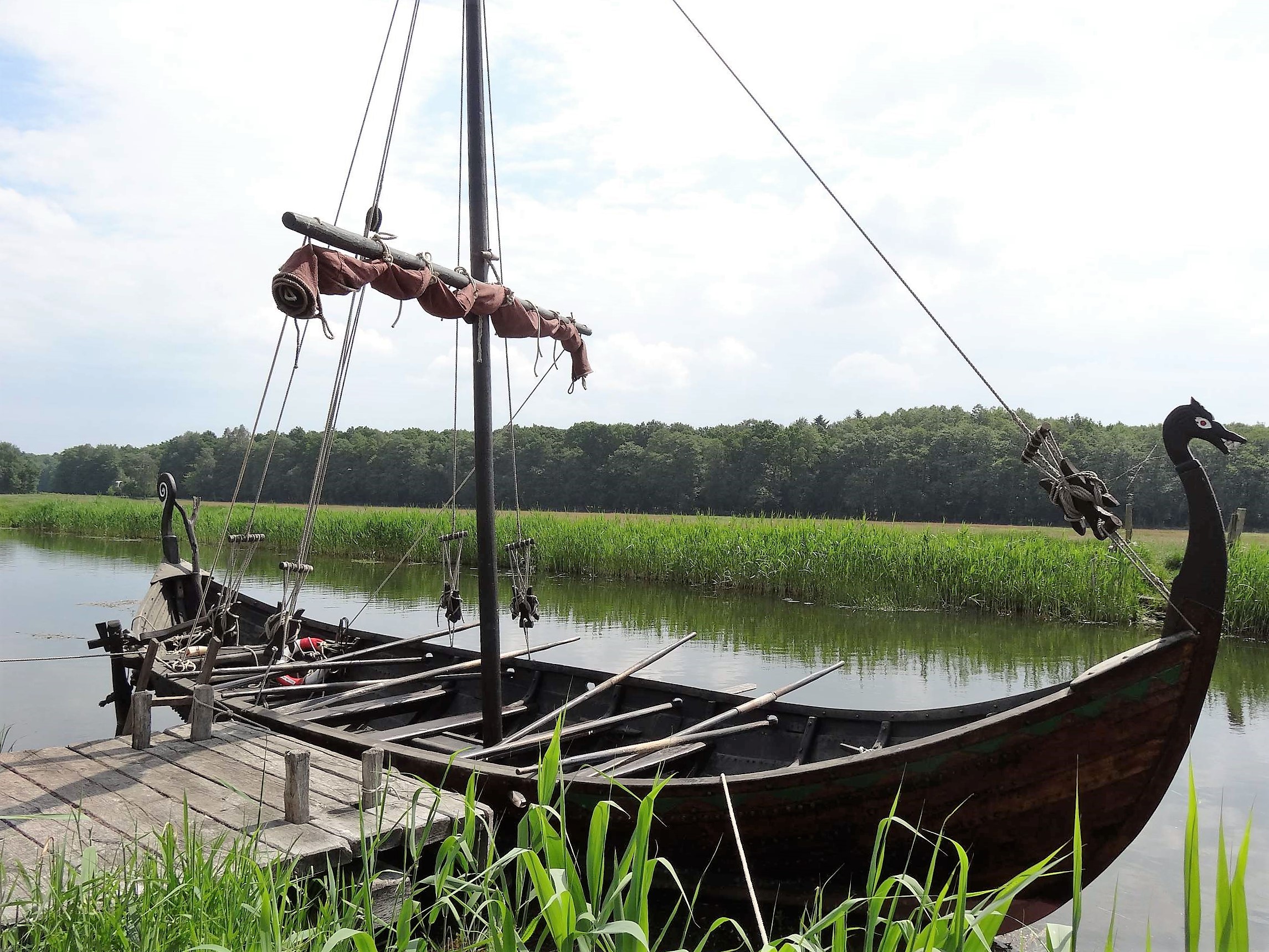 Am Ufer der Uecker liegt ein Segelbootnachbau der Ukranen. Nach Anmeldung werden Ausflugsfahrten mit verschiedenen Booten angeboten.