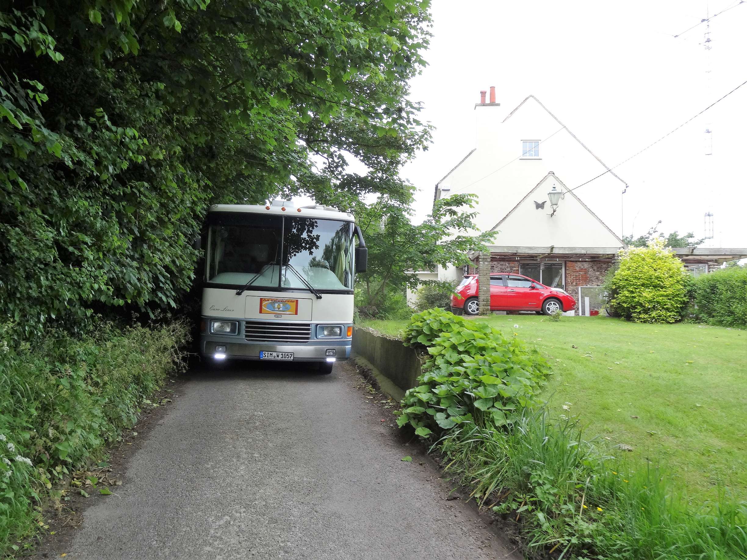 Da wir uns noch ein bisschen in der Gegend umsehen möchten, der Campingplatz jedoch trotz Mitgliedschaft im Caravan Club zu teuer ist, wechselten wir für die nächsten drei Nächte auf den „Aerial Farm CL“ in Whitfield. CL steht für Certificated Location, das sind Plätze, die günstiger sind und sich meist auf Privatgelände befinden. Der „Aerial Farm CL“ ist eine Wiese hinter dem Haus des Besitzers auf dem Lande, ebenfalls mit Kaninchen als heimliche Bewohner. Vor unserer Anreise telefonierten wir mit dem Besitzer, ob der Platz für unser großes Motorhome geeignet ist. Von der Hauptstraße jedoch abgebogen, führt eine einspurige, rechts und links hoch bewachsene Straße zum Grundstück. Das ist eng, aber machbar. Die Wiese ist dafür groß.