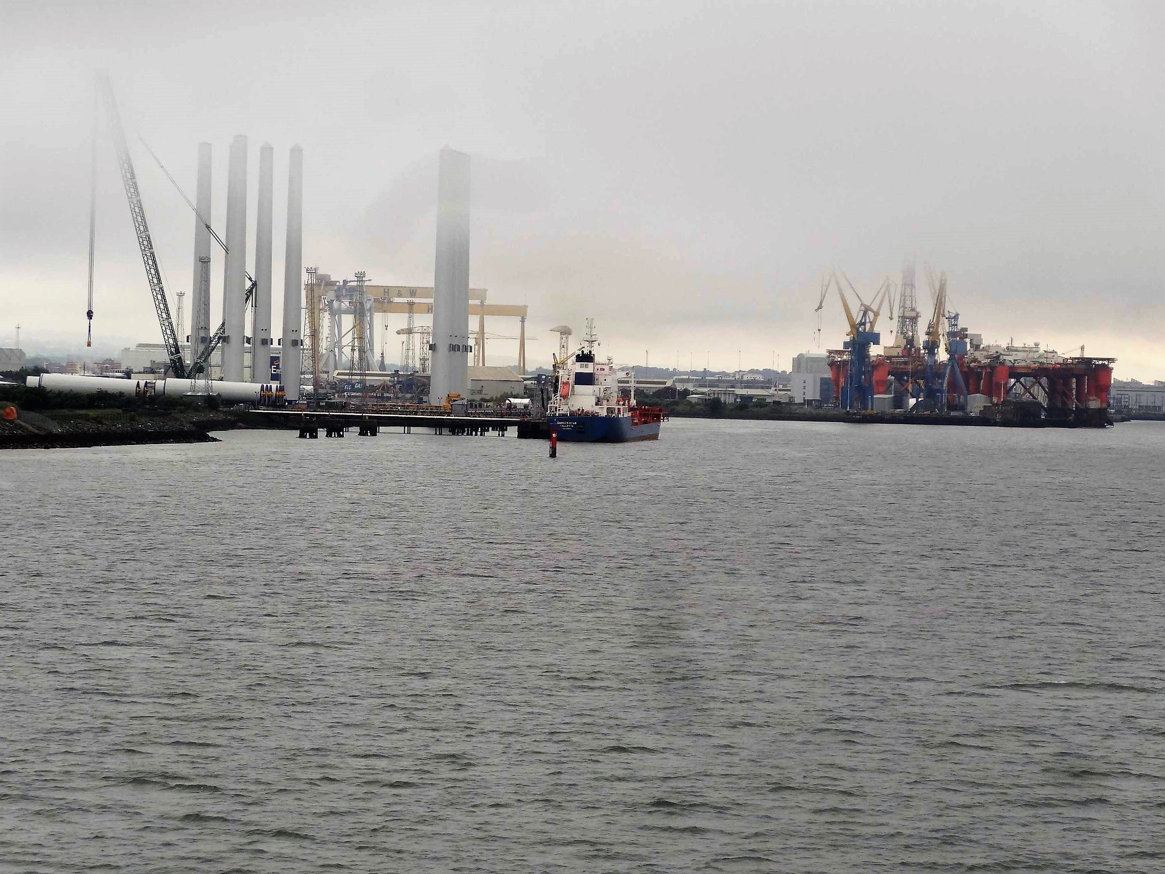 Die Fähre der Stenaline legte im Hafen von Belfast an. Es ist eine Fähre, auf der auch die Außendecks begehbar sind. Trotz Regens, kurz vor Irland in Nebel übergehend, so dass das Nebelhorn zum Einsatz kam, nahmen wir die Gelegenheit war, uns frischen Wind um die Nase wehen zu lassen. Kurz vor Belfast lichtete sich der Nebel zum größten Teil und wir konnten die Küste sehen. Seevögel begleiteten uns, die Ausschau nach Delfinen blieb wieder einmal erfolglos.