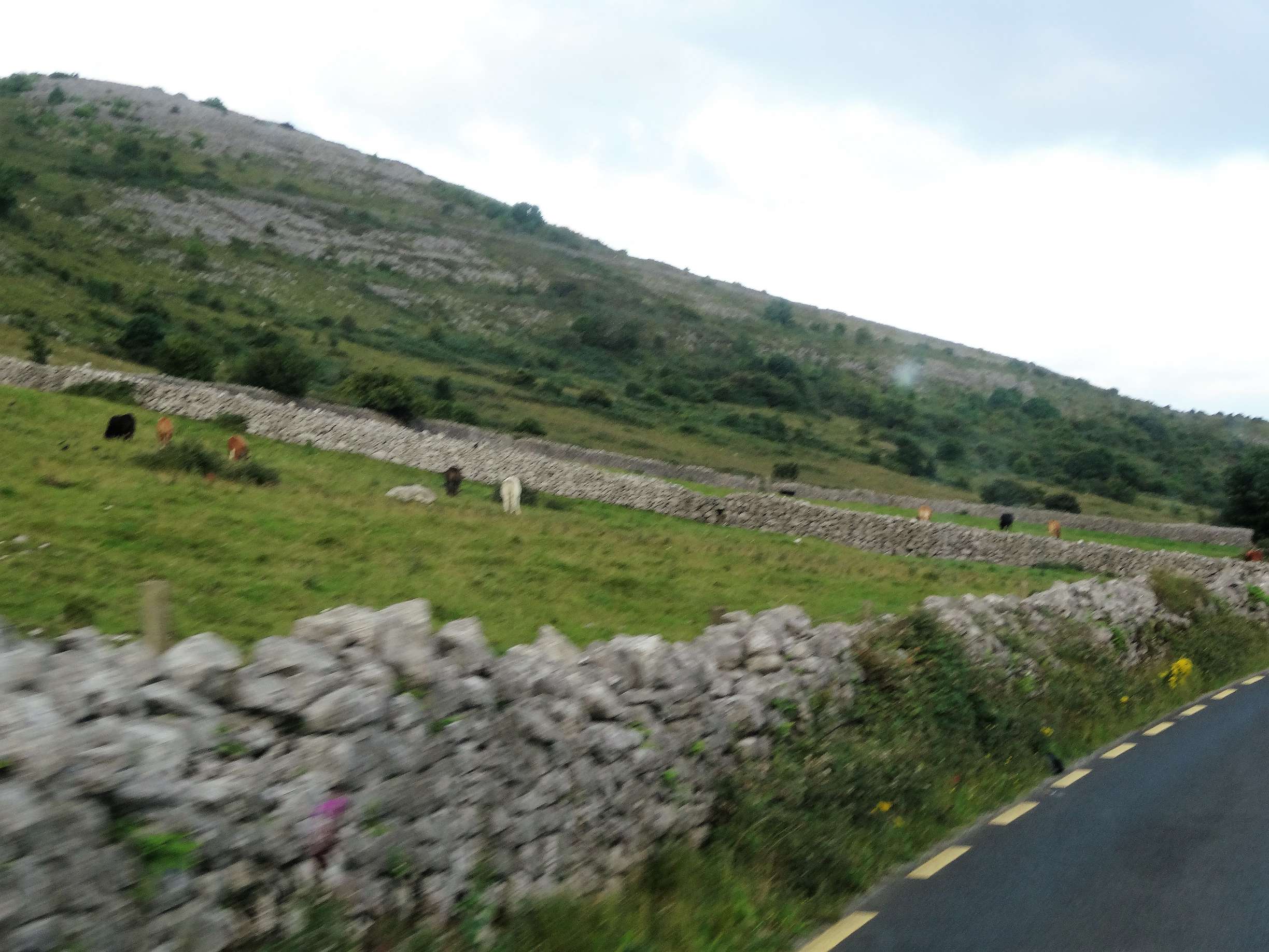 Schon bald hinter Kinvarra beginnt der Burren. Es ist ein steinreiches Gebiet, überall liegen Steine herum, Baumaterial für die allgegenwärtigen Mauern, die das Land durchziehen. Die Hügel sind kaum bewachsen, so dass sie wie große Steinhaufen aussehen.