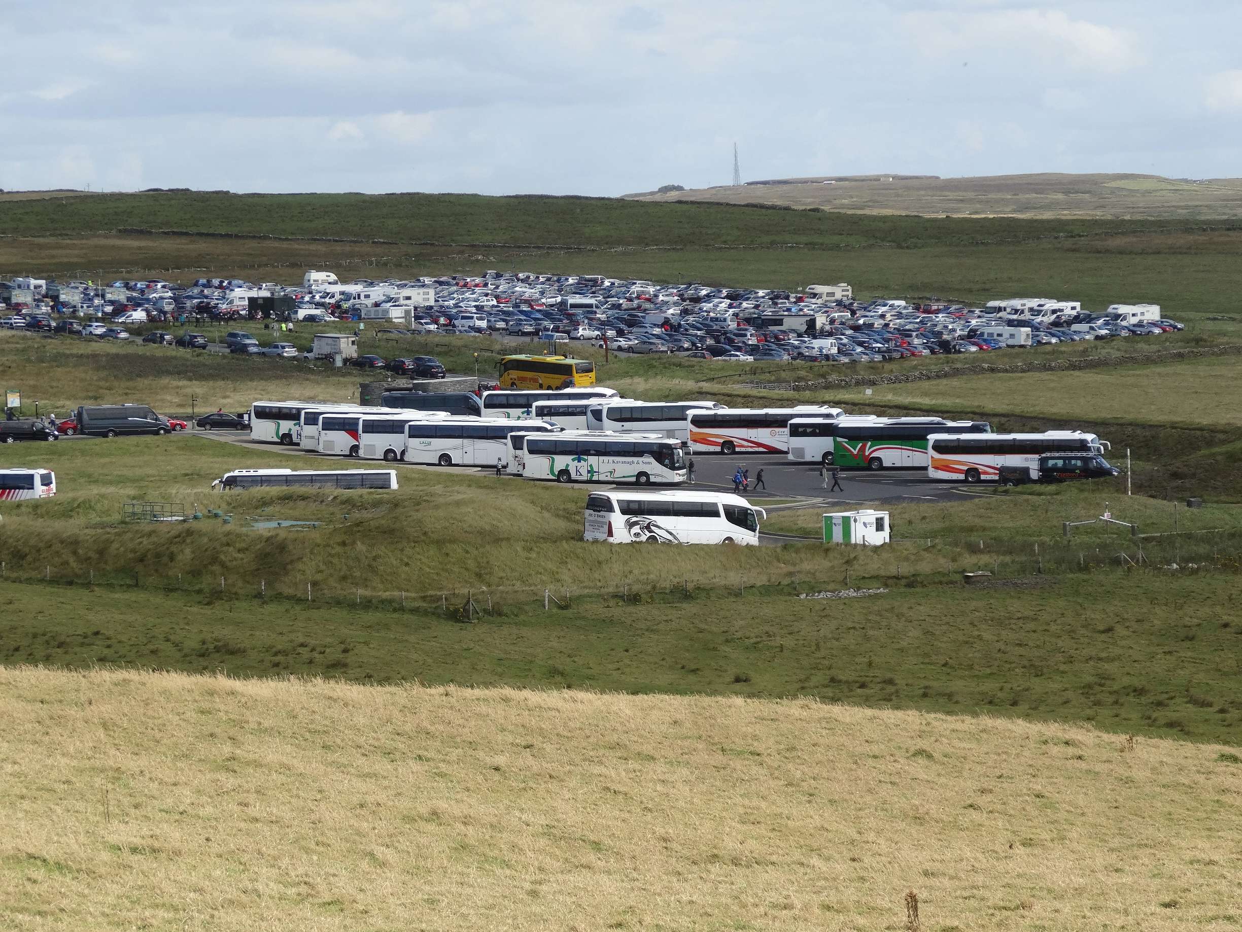 In der Ferienzeit ist es schwer angeraten, früh auf den jeweiligen Parkplätzen der Besucherzentren zu sein. Sie werden rappelvoll, was bis zum Abend anhält. Noch vor 8 Uhr standen wir auf dem Parkplatz bei den Cliffs of Moher. Da muss man noch keinen Obolus bezahlen. Ab zirka 8 Uhr muss man dann 6,- Euro/Person bezahlen. In dem Preis sind alle Attraktionen der Cliffs enthalten, außer der O´Brien´s Tower (2,- Euro).