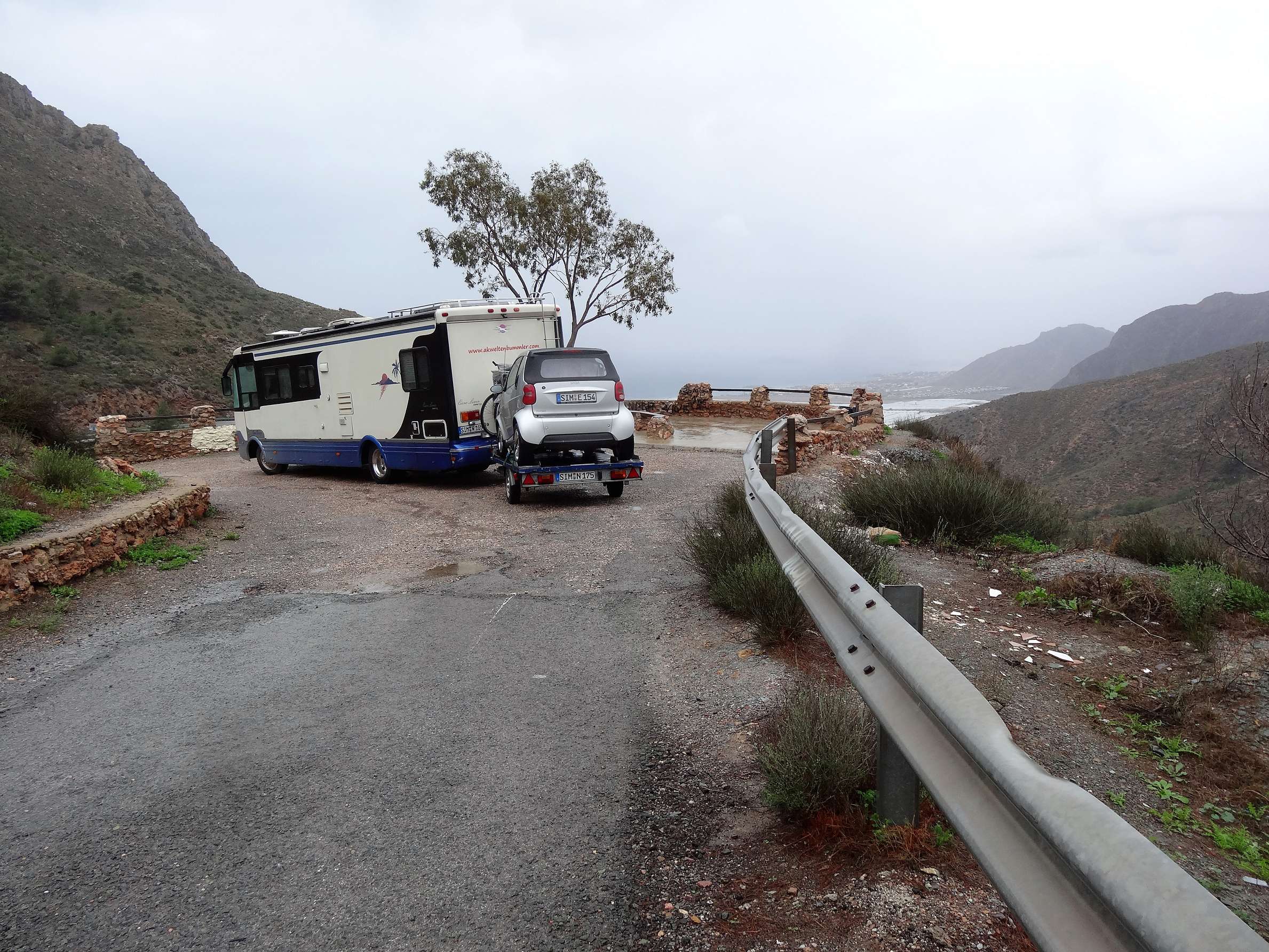 Kurz hinter Isla Plana liegen zwei kleine Parkplätze direkt am Meer. Gerne hätten wir hier die Nacht verbracht, aber der Sturm rüttelte zu stark am Motorhome, so dass wir uns einen anderen Platz suchen mussten. Den fanden wir zufällig am Ortsrand von Puerto de Mazzarón, wo schon andere Wohnmobile standen. Es regnete unaufhörlich, keine Chance, sich umzusehen.
