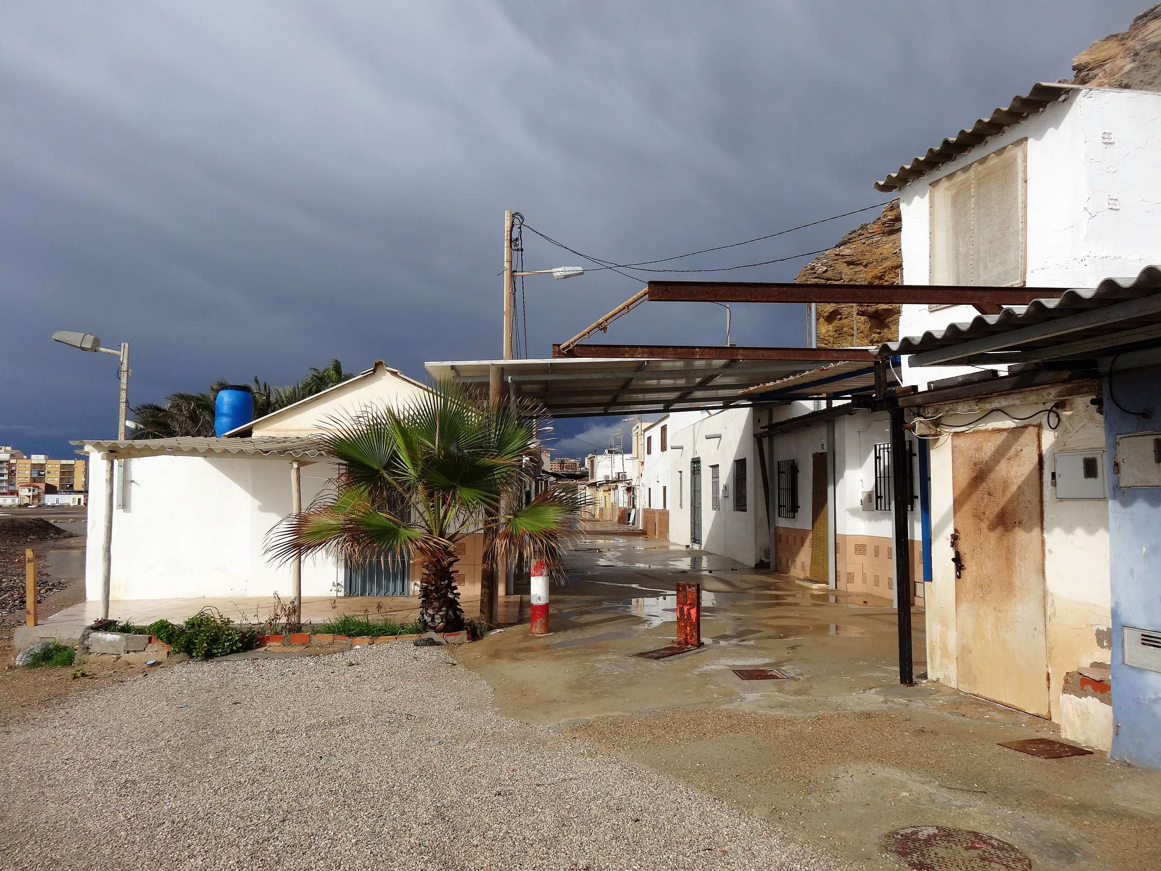 Erst am Nachmittag des nächsten Tages spazierten wir durch Puerto de Mazzarón. Straßen und Parkplätze stehen teilweise unter Wasser. Am westlichen Strand stellte sich die Frage: Wo hört der Parkplatz auf, wo fängt das Meer an? Eine winzige Siedlung mit winzigen Häuschen steht unterhalb des Berges direkt am Wasser.