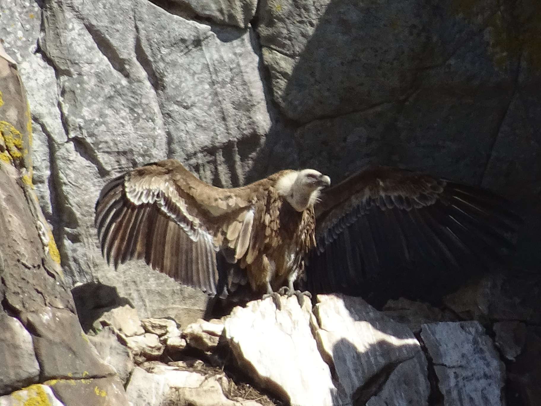 Unverhofft kommt, na ja, manchmal. Inzwischen haben wir zwei Gebiete auf spanischem Gebiet herausgesucht, in dem die Wahrscheinlichkeit hoch sein soll, europäische Geier zu beobachten. Ganz zufällig stießen wir in den Felsen gleich hinter der römischen Stadt auf die großen Vögel. Schnell vergaßen wir alles andere und versuchten, den Geiern näher zu kommen. Eine ziemlich kaputte Straße führt zu mehreren Aussichtspunkten über Bolonia und zu den Geierfelsen. Um die zehn Gänsegeier kreisen um die hellen Felsen, in denen sich auch mehrere Höhlen befinden. Im Moment werden Junge aufgezogen, einige stehen kurz vor ihrem ersten Flug. Solange sich unter ihren Nisthöhlen etwas bewegt, verharren die Jungvögel bewegungslos und sind praktisch unsichtbar. Ist es länger ruhig, kommen sie in Bewegung, schauen in die Weite, putzen sich oder trainieren für ihren ersten Flug. Die Altvögel versorgen die Jungvögel mit Beute, während mindestens ein Geier die Lage beobachtet. Immer wieder fliegen mehrere Tiere um die Felsen. Ein starker Luftstrom ist zu vernehmen, wenn die Vögel dicht über den Kopf hinwegfliegen. Man sollte dabei jederzeit halbwegs in Deckung bleiben, um sie richtig beobachten zu können. Es ist unbestritten eines der schönsten Erlebnisse, die man haben kann.