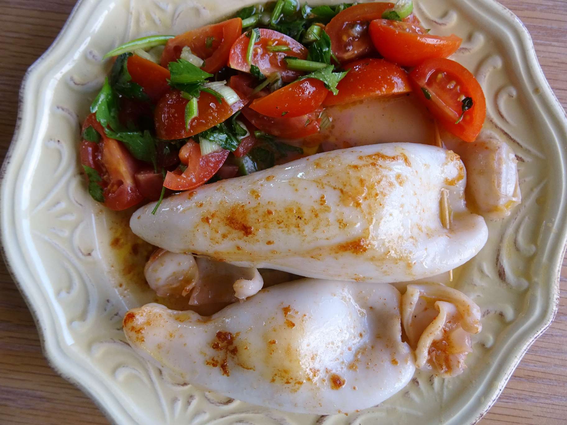 Im Internet suchte ich nach Informationen, wie man die Kalmare küchenfertig bekommt. Die Augen hatte der Händler schon herausgeschnitten. Mir blieb nur noch, den Kopf aus der Tube zu ziehen, den Schnabel zu entfernen, die Tube zu leeren und abzuziehen sowie das Fischbein zu entfernen. Selbstverständlich wird abschließend alles noch einmal abgespült. Das Ganze ist recht einfach, aber eine echte Friemelei und Sauerei. Das nächste Mal werden die Kalmare wieder küchenfertig gekauft. Die Tuben und Flügel kann man kleinschneiden, mit Knobi und Zwiebel ganz kurz anbraten, mit Petersilie, Salz und Pfeffer mischen und die Tuben damit füllen. Die werden dann einfach nur noch sehr kurz rundum gebraten oder gegrillt, wirklich nur sehr kurz, sonst werden sie gummiartig.