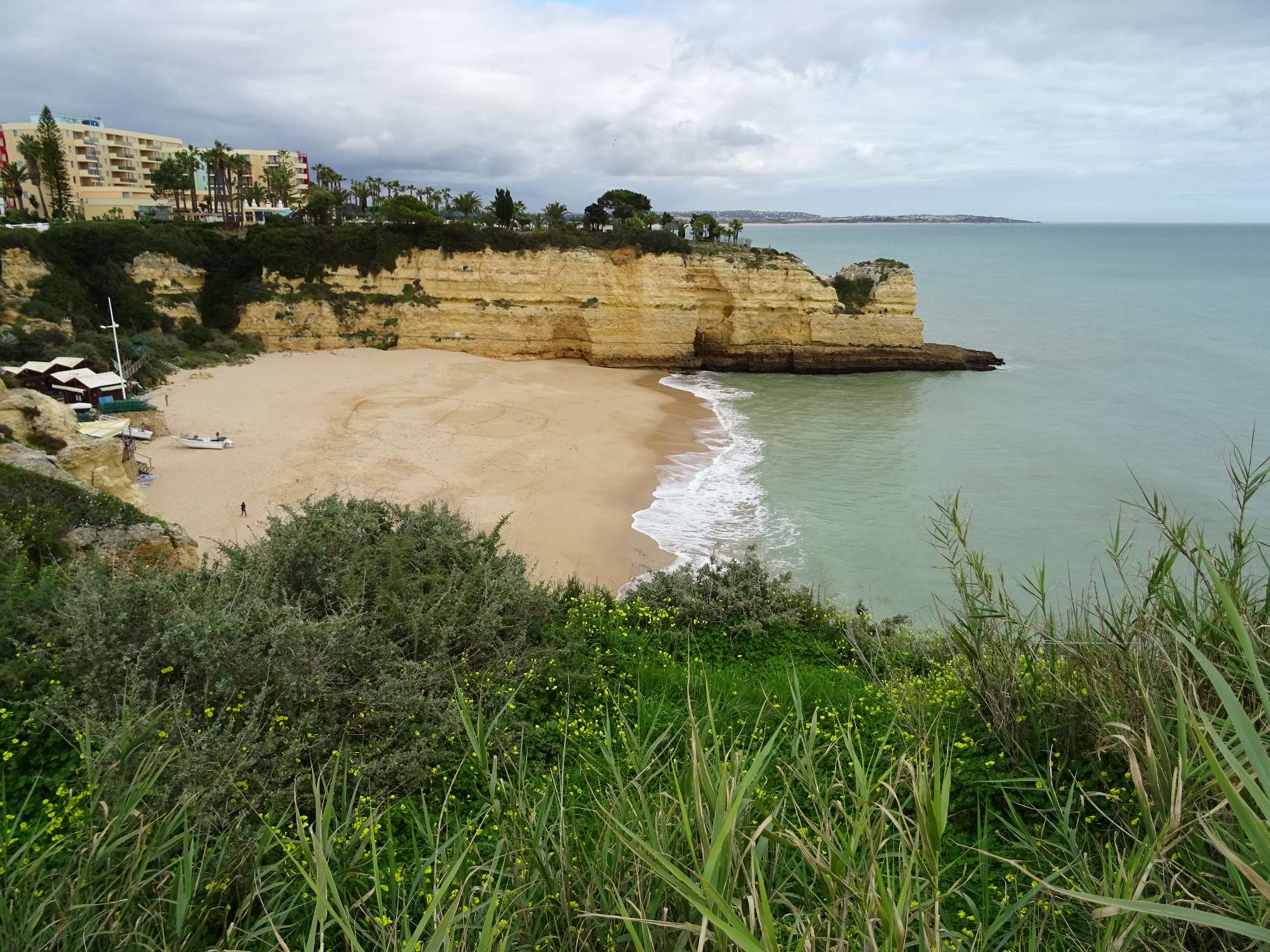 Von der Schönheit der Steilküste nicht genug bekommend, steuerten wir auch noch Praia de Cova Redonda an. Das liegt gleich westlich von Armação de Pera. Auf einer Felsnase steht eine kleine Kapelle. Links davon liegt der kleine Strand Praia d. Cova Redonda mit einer kleinen Strandkneipe, auf der anderen Seite schließt sich der längere Praia d. Seniora da Rocha an. Von hier aus sieht man schon Armação.