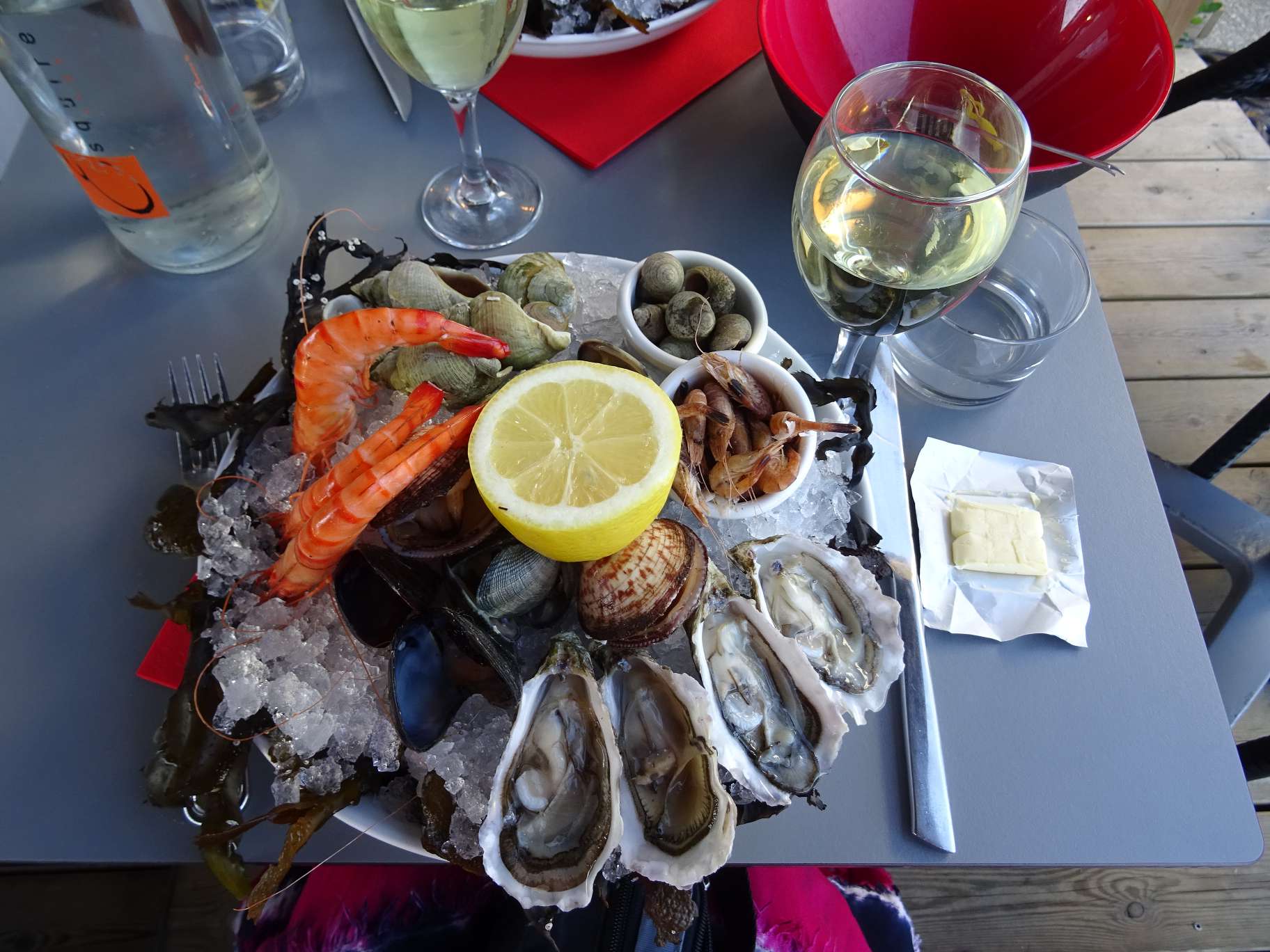 Wir besuchten mehrere Austernfischerdörfer, die heute von vielen Neubauten umgeben sind. Alle sind sie vom Aussehen her etwas verschieden. Manche der alten Hütten sind prima zurechtgemacht, manche schön begrünt, andere sind eben, wie sie sind. Manche dienen heute auch als Ferienwohnung. Alle Austernfischer haben das gleiche Angebot. Es gibt nur wenige, die auch einmal andere Meeresfrüchte oder gemischte Platten mit Austern und Meeresfrüchten anbieten. Dazu gibt es meist Brot und Wein. Wir gönnten uns im L´Esquirey in Andernos-les-Bains eine Meeresfrüchteplatte für 16,-€. Für das, was hier alles auf der Platte war, frisch und schmackhaft, hätten wir in Deutschland wahrscheinlich bald das Doppelte bezahlt. Das ist einfach nur ein Genuss.