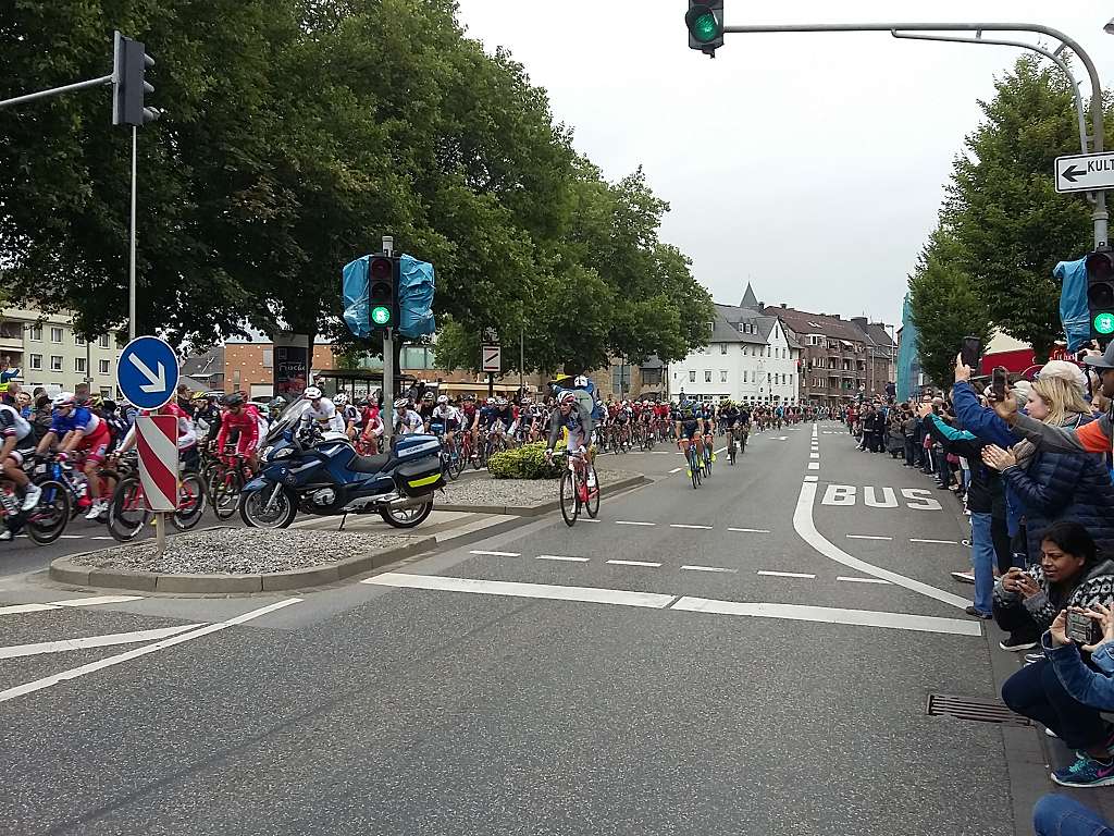 Am vorletzten Tag unseres Aufenthaltes in Jülich, am 2. Juli, kam die Tour de France durch die Stadt. Sie startete einen Tag vorher in Düsseldorf. Wir waren neugierig und gingen gegen 13 Uhr in die Stadt, um zu sehen, was da los ist. Die Hauptstraße war von 12-17 Uhr komplett gesperrt. Lange bevor die Radfahrer eintrafen, kamen jede Menge Werbefahrzeuge, man sprach von 150, die Strecke entlang gefahren. Es wurden Fanartikel verkauft und „Kamelle“ geworfen, allerdings meist aus Werbeartikeln bestehend. Dann kamen immer wieder vereinzelt Autos, Motorräder, zum Teil von der französischen Gendarmerie. Viele der Werbefahrzeuge sahen wie einem Karnevalsumzug entlehnt aus. Es ist unglaublich, wie viel Vorgeplänkel da so abläuft, bevor es zur Sache geht.