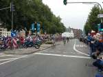 Gut zwei Stunden mussten wir warten, bis die Hauptdarsteller der Tour de France in Jülich ankamen. Dann ging alles sehr schnell. Nur zwei Minuten später war alles vorbei. Vier Fahrer bildeten die Vorhut, eine Weile später kam das Hauptfeld, wenig später ein paar Nachzügler, dazwischen fuhren Begleitfahrzeuge. Den Abschluss bildeten die Teamwagen mit Ersatzrädern und -teilen, und das Abschlussfahrzeug. An den Straßenrändern herrschte überraschenderweise große Disziplin. Manche Leute verbrachten ihren Tag mit Tischen und Stühlen ausgerüstet am Straßenrand.