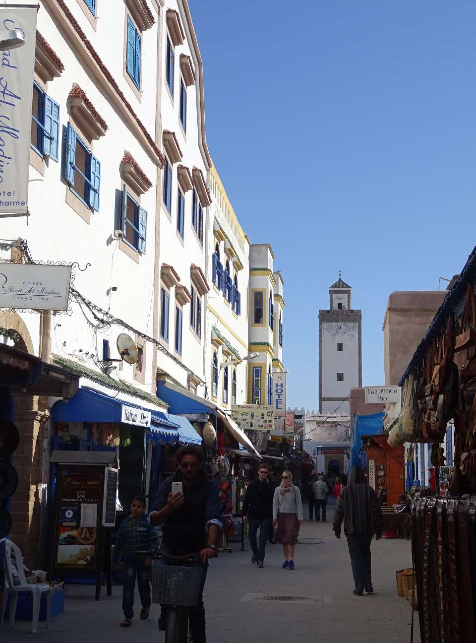 Enttäuscht stürzten wir uns nun in die Gassen der Medina. Die vorherrschenden Farben Essaouiras sind weiß und blau. Viele Cafés, Restaurants und Hotels buhlen um Gäste. Lederwaren, Holzschnitzereien und Arganprodukte sind die vorherrschenden Waren, die verkauft werden.
