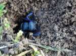 An einem der Abende, zur Zeit freuen wir uns über sehr warme Frühlingstage, fand ich eine Stelle im Garten, an der sich zwei kleine Löcher befanden. Das Erdreich war am Rand der Löcher aufgehäuft, sehr merkwürdig. Ein genaueres Hinsehen offenbarte, dass da gerade zwei neue Ölkäfer das Licht der Welt erblickten. Der Entwicklungsweg der Schwarzblauen Ölkäfer ist wohl der gleiche, wie bei den Maikäfern. Es war sehr aufregend, dies zu beobachten.
