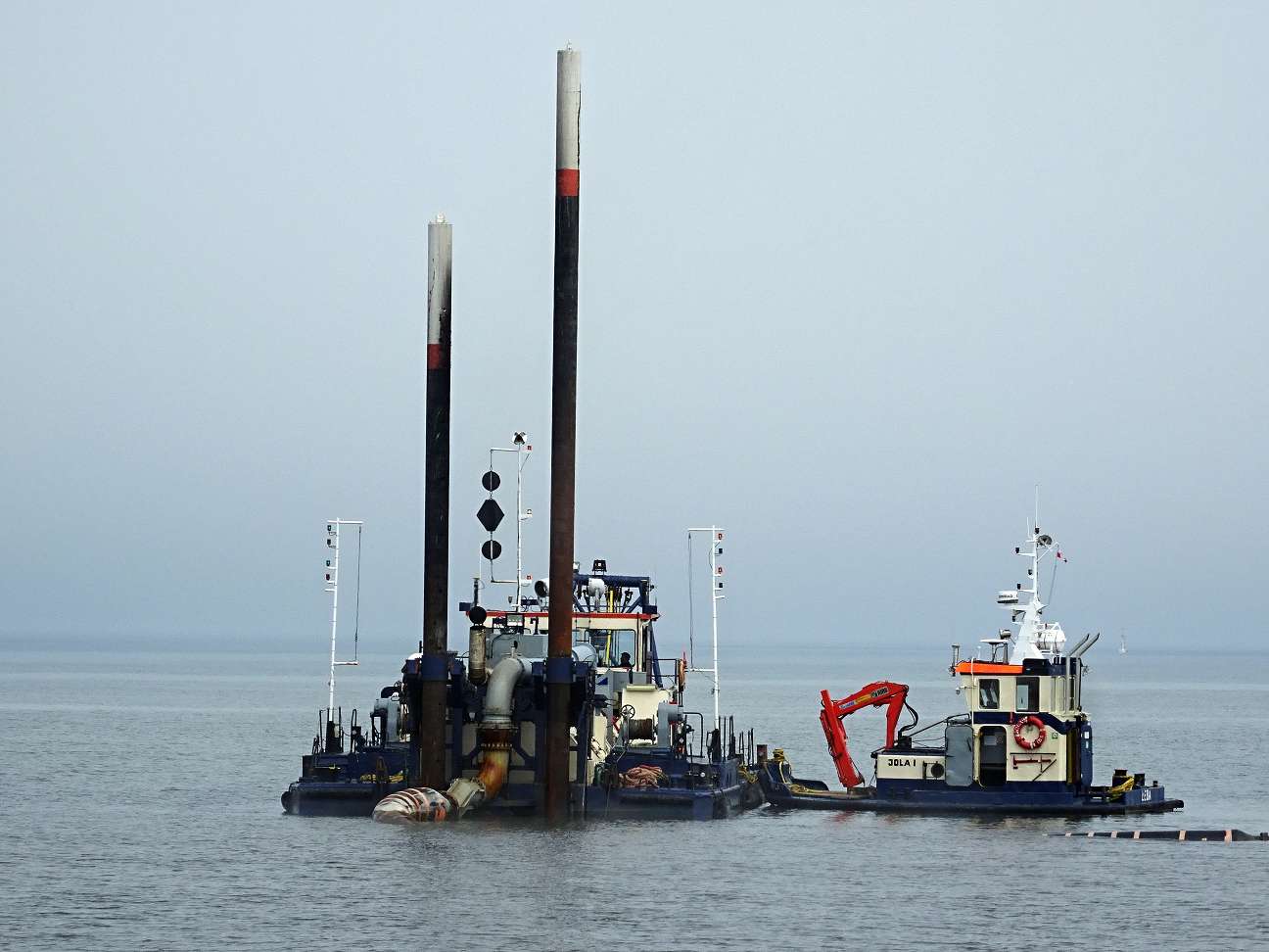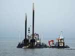 Vor der Hafeneinfahrt wird die Fahrrinne ausgebaggert. Das Sand-Wasser-Gemisch wird am Strand wieder abgelagert. Es gelangt über eine lange Rohrleitung, die im Moment den breiten Strand verschandelt, an den gewünschten Ort.