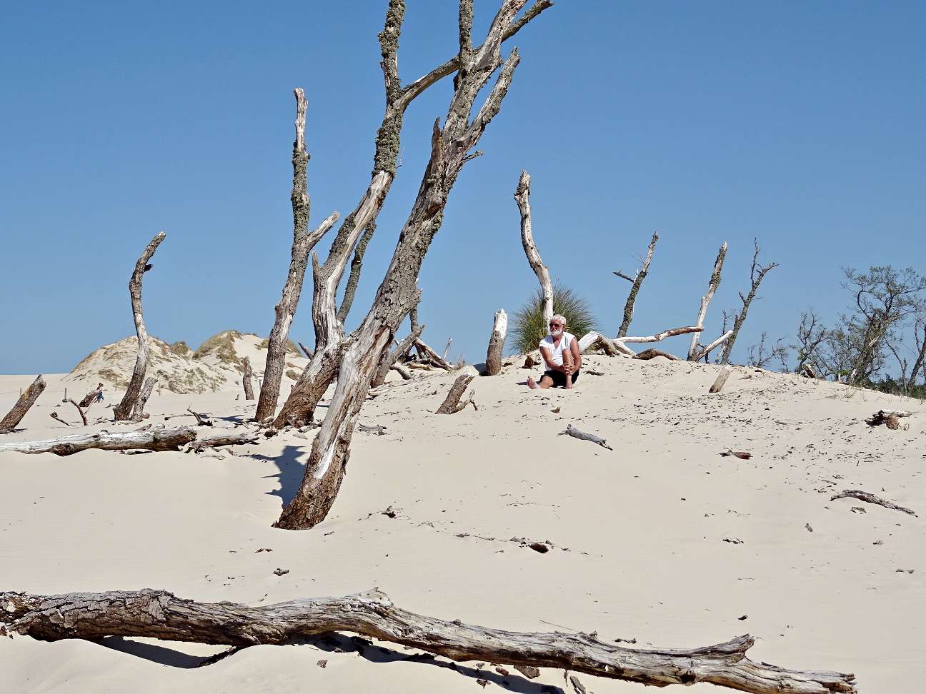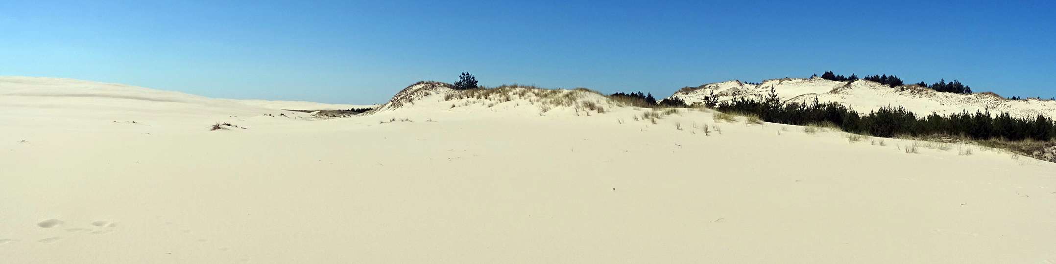 Die Lonsker Düne ist eine Wanderdüne, die irgendwann in der Vergangenheit den Ort Łącka unter sich begraben hat. Daher stammt der Name der Düne, die jedes Jahr 10 Meter nach Osten wandert. Der höchste Punkt der Düne misst 42m. Die Düne will allerdings erst einmal erklommen werden. Der Hang ist sehr steil und hoch. Jeden Schritt muss man dreimal machen, da der feine Sand immer wieder unter den Füßen nachgibt. Wenn man es dann aber irgendwann geschafft hat, wird man mit einem Bild belohnt, welches in Europa einzigartig ist. Nichts als heller feiner Sand. Dort, wo die Düne den Waldrand bedeckt hat, schauen noch kahle Reste der Baumstämme, verzweifelt nach Luft ringend, aus dem Sand. Für die meisten Bäume ist es jedoch schon zu spät. Flechten besiedeln das tote Holz.
