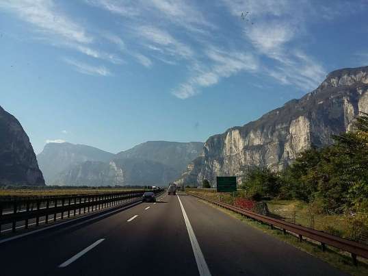 Ab der italienischen Grenze geht es fast nur noch abwärts, durch das wunderschöne Eisack-Tal mit vielen Festungen, über Brixen und Bozen nach Trento. Beeindruckend sind die Bergwelten rechts und links der Autobahn, die das Tal mal weiter, mal enger werden lassen. Wein- und Apfelanbau geben im Tal den Ton an. Almwiesen ziehen sich weit die Berghänge hinauf, auch viele Häuser.