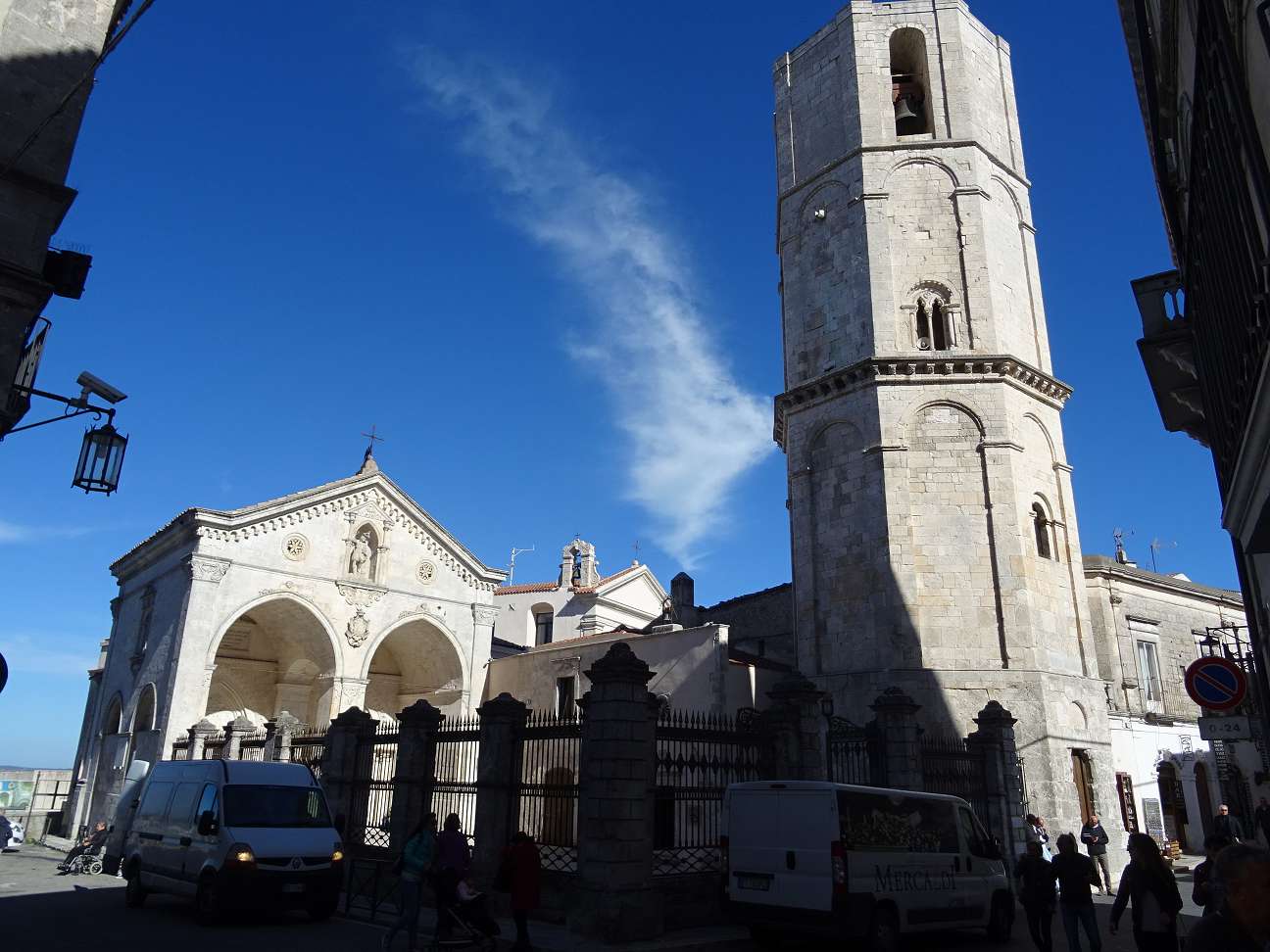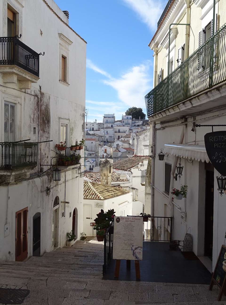 Der interessante Teil der 1000 Jahre alten Stadt befindet sich ganz oben auf der Spitze, wo die Kirche San Michele und das Kastell zu finden sind. San Michele ist eine Grottenkirche, das heißt, die eigentliche Kirche befindet sich unter der Erde. Nur die Eingangshalle und der Glockenturm liegen überirdisch. Neben dem Kastell steht eine alte Häuserreihe, die typisch apulisch aussieht.