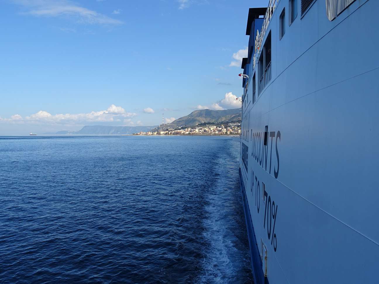 Die Überfahrt dauert etwa 20 Minuten. Die Straße von Messina ist bis heute eine der gefährlichsten Wasserstraßen der Welt. Viele Schiffe sind seit der Antike schon den unberechenbaren Strömungen zum Opfer gefallen. Odysseus befuhr auch diese Meerenge. Das war an der Stelle mit dem großen Strudel. In Scilla wurden er und seine Mannschaft dann Opfer des mehrköpfigen Ungeheuers Scylla. Nur für diejenigen, die sich für die Odyssee interessieren.