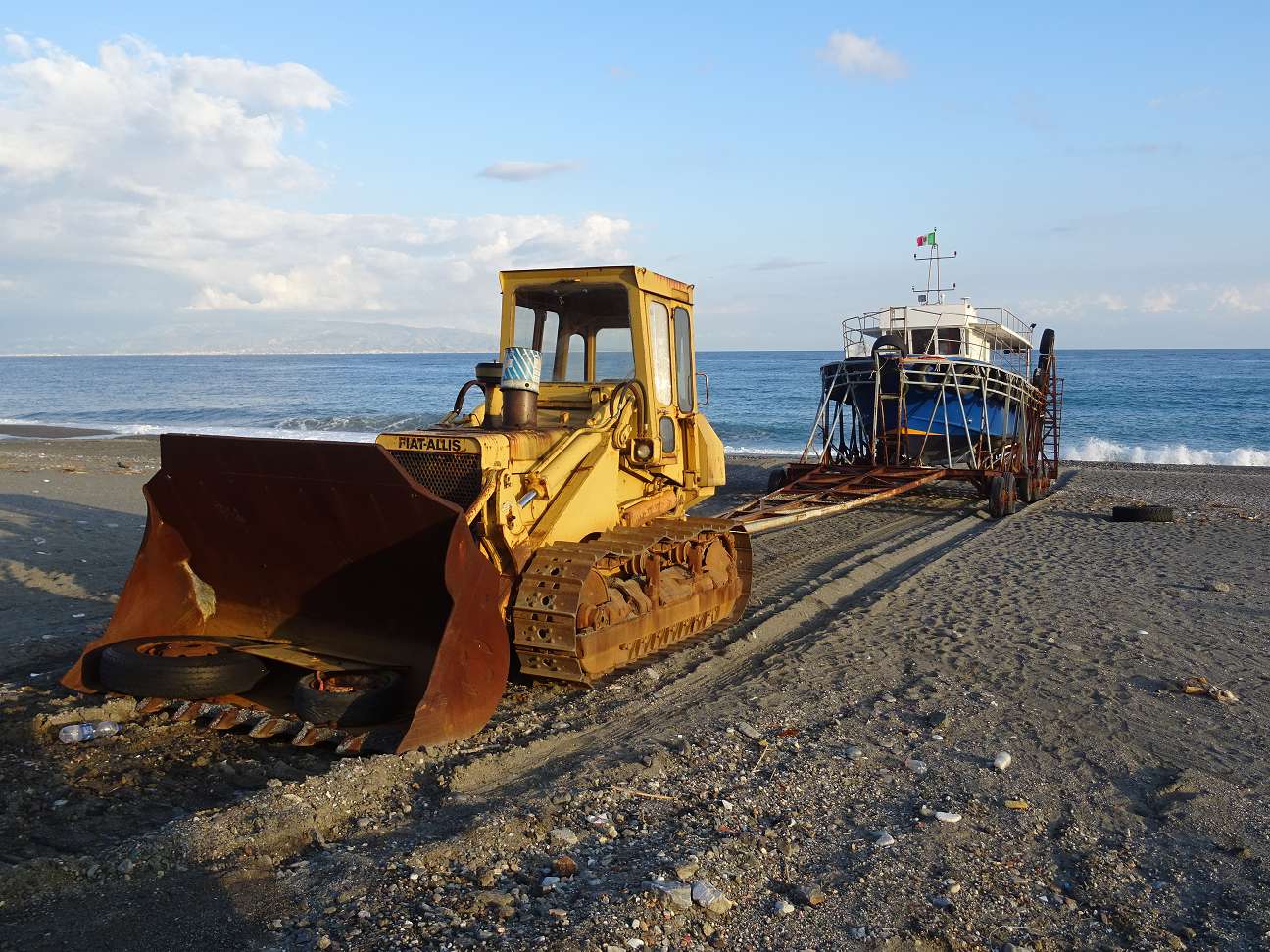 In Messina angekommen fuhren wir Richtung Süden weiter. Wir hatten unterwegs einen Tipp bekommen, dass wir uns in Giardini-Naxos knapp südlich von Taormina aufhalten sollten. Eigentlich wollten wir bei Scilla auf dem Festland noch einmal übernachten und uns die Stadt ansehen, aber das hat aus Platzgründen nicht geklappt. Die Fahrstrecke wurde für diesen Tag dann zu lang und so übernachteten wir auf einem Parkplatz direkt am Strand in Nizza di Sicilia. Dort unternahmen wir noch einen kleinen Spaziergang. Auf unseren Reisen haben wir bisher einige Möglichkeiten gesehen, wie die Fischer ihre Boote an Land bekommen. Hier in Nizza ziehen kleine Raupen die Boote aus dem Wasser. So eine Raupe kostet sicher eine Menge Geld, trotzdem hat fast jedes Boot seine eigene Raupe, Wahnsinn. Warum kann man sich nicht eine Raupe für mehrere Boote teilen?