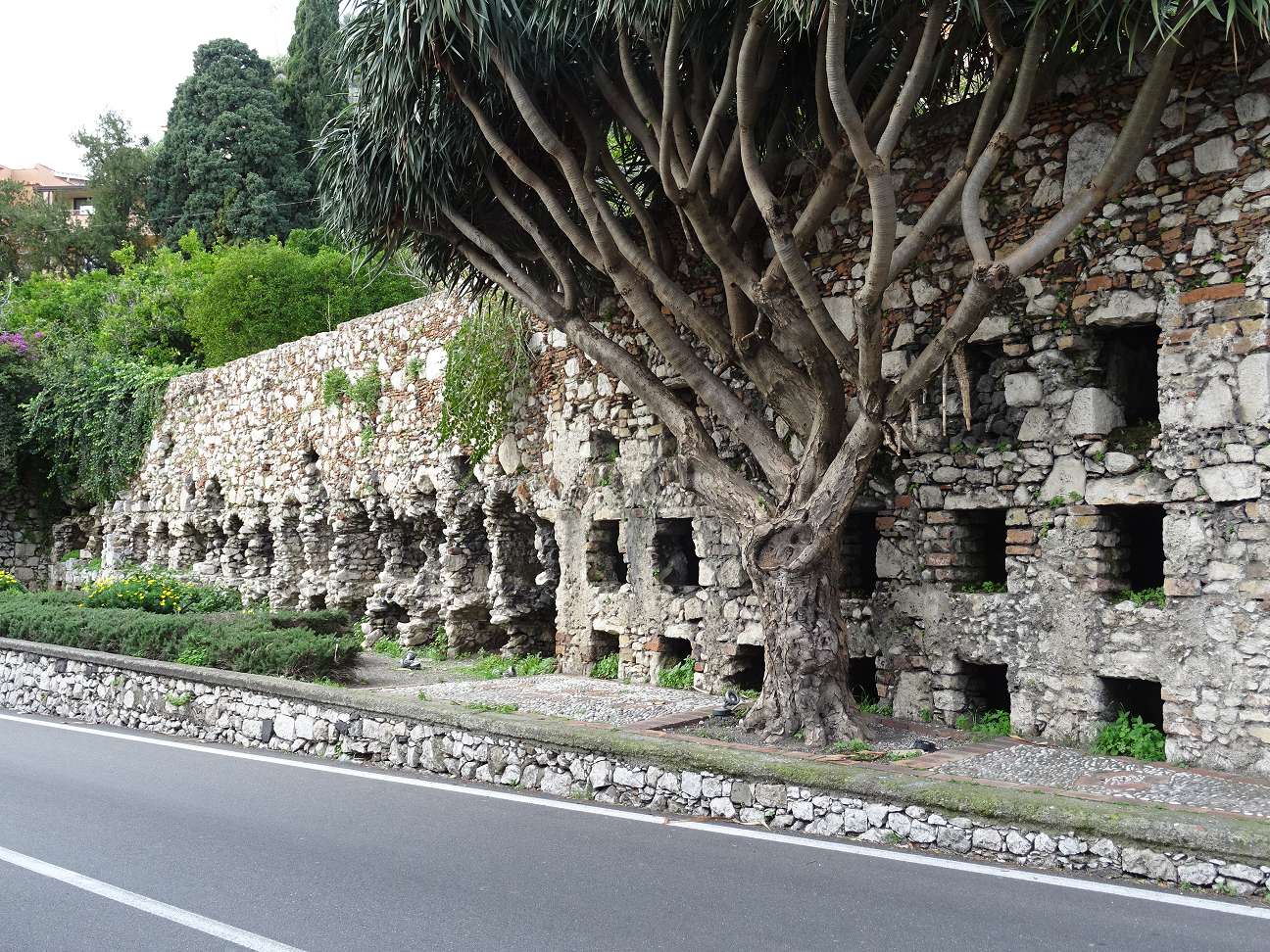 Schon immer wussten die Menschen die traumhafte Lage zu schätzen. Seit der Steinzeit dient der nördliche Hang des Monte Tauro als Nekropole. Die Überreste früherer Begräbnisstätten wurden beim Bau der Straße nach Taormina teilweise freigelegt. Was heute zu sehen ist, sind römische Bauwerke aus Kalkstein, in deren Nischen die Toten beigesetzt wurden. Das sehenswerteste Stück der terrassenförmig angelegten Grabanlagen ist knapp unterhalb des Belvedere-Aussichtspunktes zu finden, direkt am Straßenrand. Die Außenwand der rechten Hälfte wurde rekonstruiert.