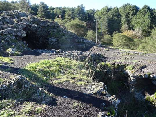 Als wir die Südseite des Ätna besuchten waren wir schon begeistert. Die Nordseite ist noch viel schöner, weil interessanter. Die Auffahrt nach Piano Provenzana beginnt in Linguaglossa. In vielen Serpentinen und oft großen Steigungen windet sich die Straße den Hang des Vulkans hinauf. Den ersten Stopp legten wir bei Rifugio Ragabo ein. Fünfzig Meter vor dem Parkplatz führt ein Fußweg rechts in den Wald, zur Grotta di Corruccio. Der Weg ist nur 250m weit. Am Ende steht man auf einem Lavatunnel. An zwei Stellen ist die Decke nur ein kleines Stück eingebrochen, so dass es aussieht, als wären das Eingänge zu Höhlen. Am Ende des Tunnels ist die Decke komplett verschwunden und eine Art Kanal führt talwärts. Die Aussicht von hier in Richtung Taormina und das Meer ist wunderschön.