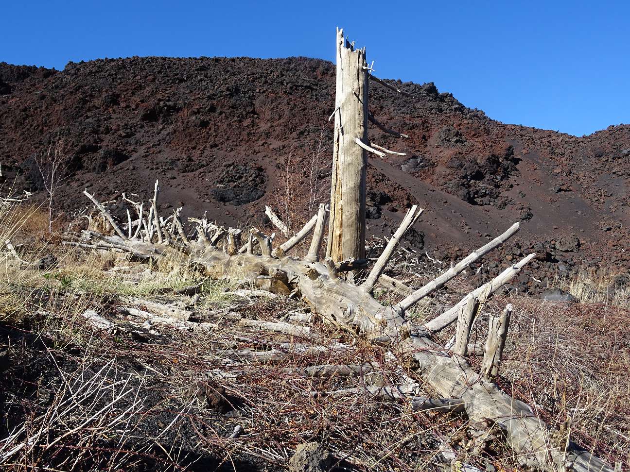 Das nächste Ziel ist Piano Provenzana auf ca. 1800m Höhe. Diese Anlage wurde auf dem Lavastrom von 2002 errichtet. Die Souvenirbuden sind geschlossen, Parkgebühren will keiner haben und man ist fast alleine mit dem Vulkan. Von hier starten mehrere Wanderwege, z.B. zum Monte Nero. Die Schranke kann man ignorieren, außer bei akuten Ausbrüchen. Mit festen Schuhen ist der Weg nach oben gut zu bewältigen. Immer wieder führt der Weg über Lava. Links vom Weg kommt man bald an einem verschütteten Haus vorbei, gegenüber ist der Rest eines Mastes noch zu sehen, den die Lava seinerzeit umgestoßen und teilweise begraben hat. Man weiß gar nicht, wo man zuerst hinsehen soll, denn man ist von einer Fülle von schönen Motiven umgeben. Nach etwa der Hälfte des Weges drehten wir um und gingen zum Parkplatz zurück.