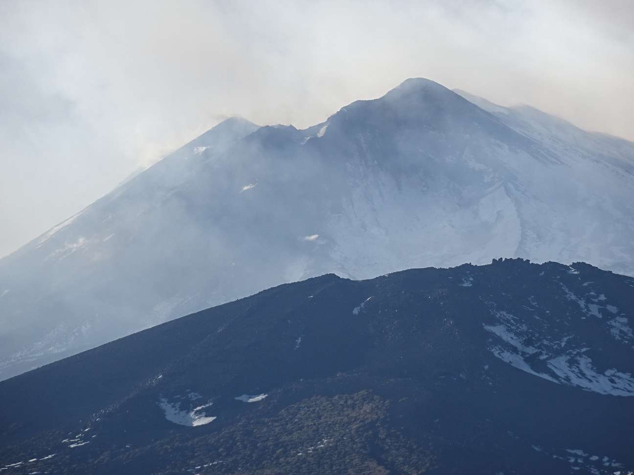 Dann ist die Straße zu Ende und man muss wieder zurück auf die Ringstraße, um nach Sant Alfio weiter zu fahren. Auf der zweiten Abfahrt nach rechts kommt man zum Rifugio Citelli, das auf 1741 Metern Höhe liegt. Das Restaurant hat wohl über den Winter geschlossen und auch sonst ist nicht viel los auf diesem Platz, aber von hier aus hörten wir, wie der Vulkan arbeitet. Dumpfe, kurze und fauchende Geräusche drangen von den Hauptkratern herunter. Die Rauchwolken, die am Vormittag noch ganz weiß waren, nahmen jetzt eine schmutzige Farbe an. Werden wir heute Abend wieder kleine Eruptionen sehen?