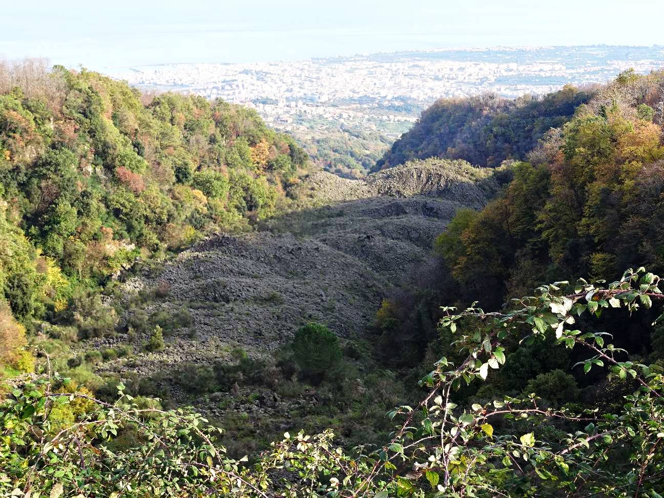 Vom Rifugio Citelli geht es fast immer abwärts. Die Serpentinenstraße verbindet weiter unten viele kleine Siedlungen miteinander, so wie am ganzen unteren Hang rund um den Vulkan. Immer wieder wurden alte Lavaströme durchstochen, die inzwischen mit Flechten bewachsen sind, um die Straße bauen zu können. Während viele dieser Ströme irgendwo am Hang enden, floss einer von ihnen bis nach Giarre. Das sieht man sehr gut vom Parkplatz in Höhe des Ortseingangsschildes von Sant Alfio aus.