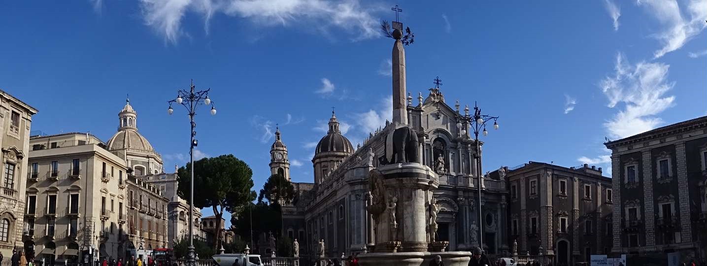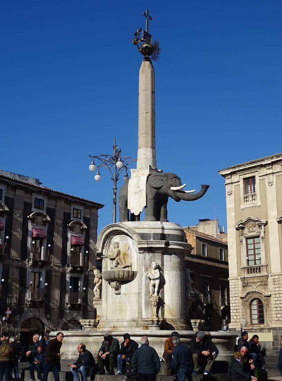 Spaziert man die Via Emanuele II wieder zurück zum Domplatz, steht man vor der berühmten Elefantensäule. Der Elefant ist das Symbol von Catania. Dieser aus Lava gefertigte Elefant auf dem Domplatz stammt aus römischer Zeit. Er wurde nach der Zerstörung durch ein verheerendes Erdbeben 1693 aus den Trümmern geborgen. 1669 wurde Catania schon einmal durch eine Ätna-Eruption dem Erdboden gleichgemacht. Der auf dem Elefanten stehende Obelisk stammt aus Ägypten und wurde wohl im alten Amphitheater als Zielsäule verwendet. Ein Künstler aus Catania kam dann auf die Idee, aus diesen beiden Teilen die Elefantensäule zu kreieren.