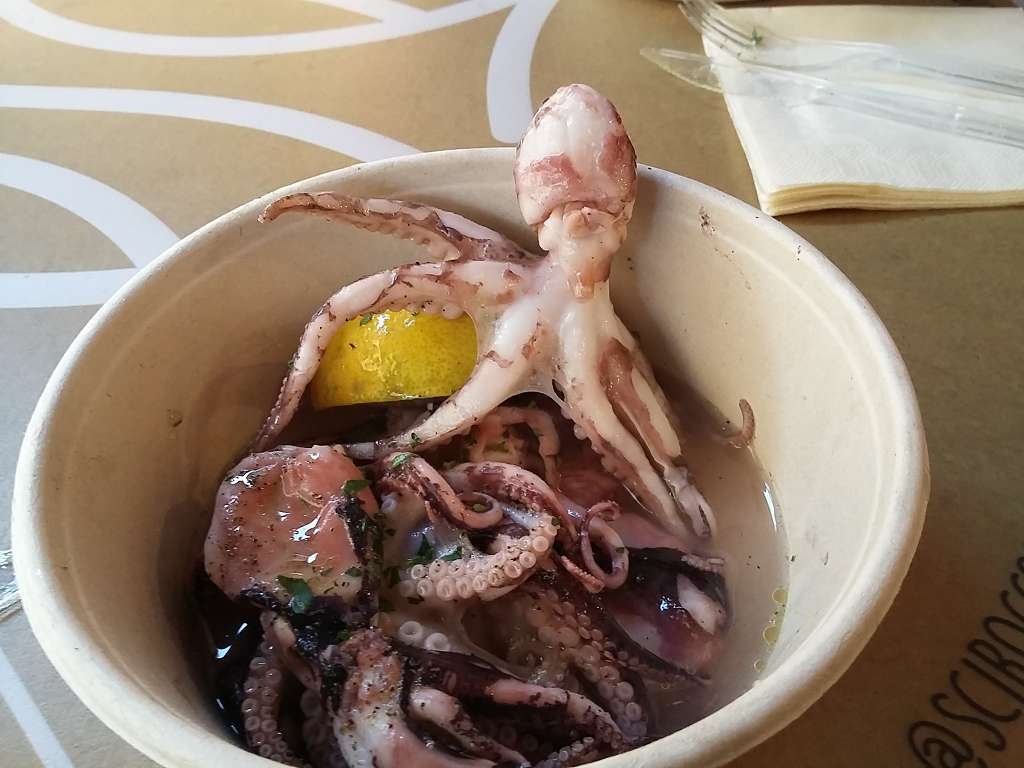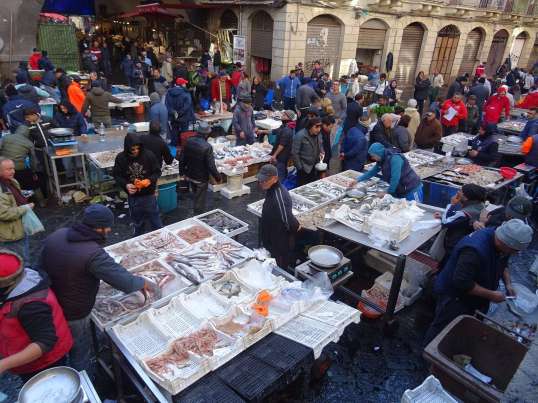 Am Domplatz steht ein grau-weißes Gebäude. Passiert man dieses an der rechten Seite, steht man auf dem Fischmarkt, welcher sich ein paar Stufen tiefer befindet. So hat man gleich einen schönen Blick über alles. Das Handeln, die Fischer, die ihre Ware anpreisen, das ganze Ambiente erinnert an einen orientalischen Markt. Die Preise sind niedrig, die Fische und Meerestiere frisch. Hier kauft man gerne ein. Leider standen wir am Anfang unseres Stadtrundganges, so dass wir keinen Fisch mitnehmen konnten. Auf der Empore bietet ein kleiner Laden in Zitronensud gegarten Baby-Oktopus an, den wir unbedingt probieren mussten. So zarten Tintenfisch hatten wir noch nie gegessen, der war einfach lecker.