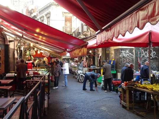Zuerst wollten wir eine Zwischenstation auf dem Weg in den Süden Siziliens einlegen und von dort aus mit dem Smart nach Catania fahren. Man riet uns jedoch dazu, mit dem Bus nach Catania zu fahren, was dann doch die bessere Entscheidung war. Für nur 8,60 € pro Person Hin- und Rückfahrt von Recanati (Giardini-Naxos) aus fährt der Bus nur wenige Schritte vom Stellplatz entfernt ab. Ohne Zwischenstopp fuhr der Bus, nicht ganz pünktlich abgefahren und mit fast einer halben Stunde Verspätung in Catania angekommen, ins das Zentrum der Stadt. Vom Busbahnhof steuert man am besten zuerst den berühmten Fischmarkt von Catania an, denn der ist nur bis zum Vormittag besuchenswert. Das ist ein Fußweg von 1,3km.