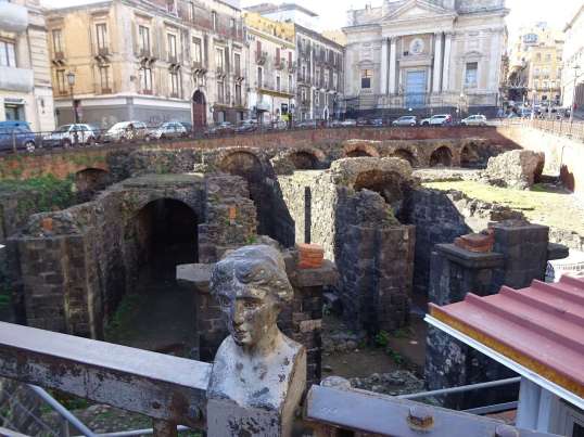 Folgt man der Via Etnea weiter, liegt irgendwann auf der linken Seite die Ausgrabungsstätte des Amphitheaters. Es wurde beim großen Erdbeben verschüttet und nur zum Teil wieder freigelegt. Dieses Amphitheater war eines der größten auf Sizilien, fasste 15.000 Zuschauer, die in 32 Sitzreihen Platz nahmen. Es hatte eine elliptische Form und maß 125×105 Meter. Es wurde im 2. Jahrhundert erbaut und Ende des 5. Jahrhunderts aufgegeben. Die Normannen nutzten beim Bau der Kathedrale im 11. Jahrhundert teilweise Steine und Säulen des Theaters.