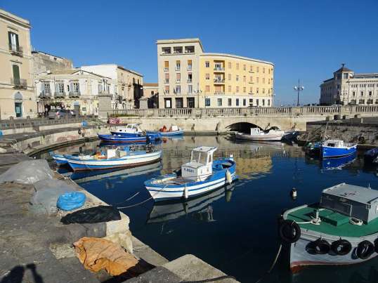 Um die Altstadt von Siracusa zu besuchen, parkten wir unser Auto auf dem Parkplatz direkt vor der Brücke zur Insel Ortigia. Die Insel ist durch zwei Brücken mit dem Festland verbunden, zwischen denen kleine Fischerboote einen Hafen gefunden haben. Von hier starten Rundfahrten per Boot an der felsigen, mit Höhlen durchsetzten Küste entlang.