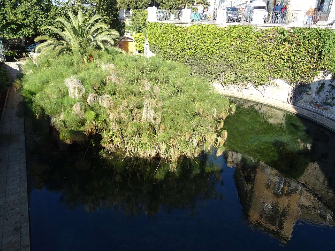 Nur ein paar Meter weiter gelangt man zur Fonte Arethusa. Dies ist eine große Süßwasserquelle direkt am Meer. Eine Insel aus Papyrusstauden nimmt fast die gesamte Wasserfläche ein, in der sich Karpfen tummeln. Das Quellwasser fließt durch eine Öffnung in der Mauer ins Meer ab. Arethusa war eine schöne Waldnymphe, die sich der Sage nach an dieser Stelle ins Meer stürzte, um dem griechischen Flussgott Alpheios zu entkommen, der ihr nachstellte.