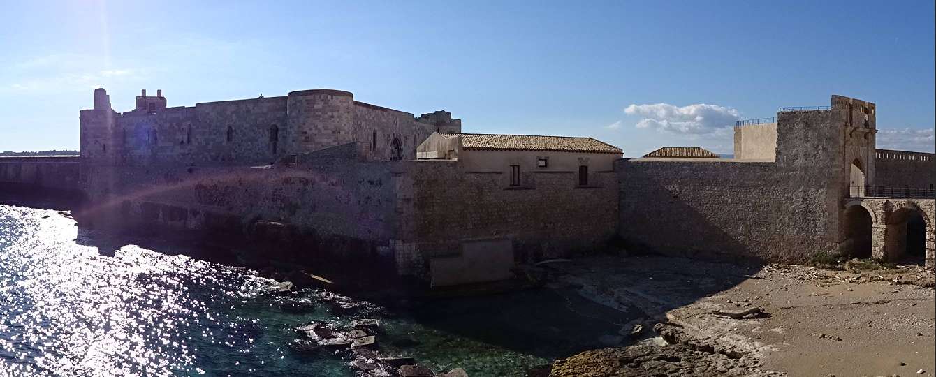 Ganz ohne Autoverkehr geht es bis zum Castello Maniace weiter, welches die Insel Ortigia zum Meer hin abschließt. Das Fort kann nur mit einem Eintrittsgeld von 4,-€ besichtigt werden, aber auf dem großen freien Platz davor kann man schön die Seele baumeln lassen, bevor man sich in die Gassen und ins Gewimmel der Altstadt begibt.