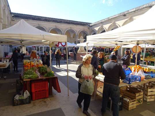 Gleich nebenan steht die alte Markthalle aus dem Jahre 1900. Es gab schon in der Antike an dieser Stelle einen Markt, aber im Rahmen der Neuorganisation nach der spanischen Besatzung baute man die Markthalle, damit die frischen Waren wie Fleisch, Fisch, Obst und Gemüse beim Verkauf nicht mehr so der Witterung ausgesetzt sind. Es entstand ein quadratisches Gebäude mit Bogenfenstern und einem Innenhof mit umlaufendem Arkadengang. Die meisten Verkaufsstände bieten ihre Waren jedoch außerhalb, rund um die Markthalle an.