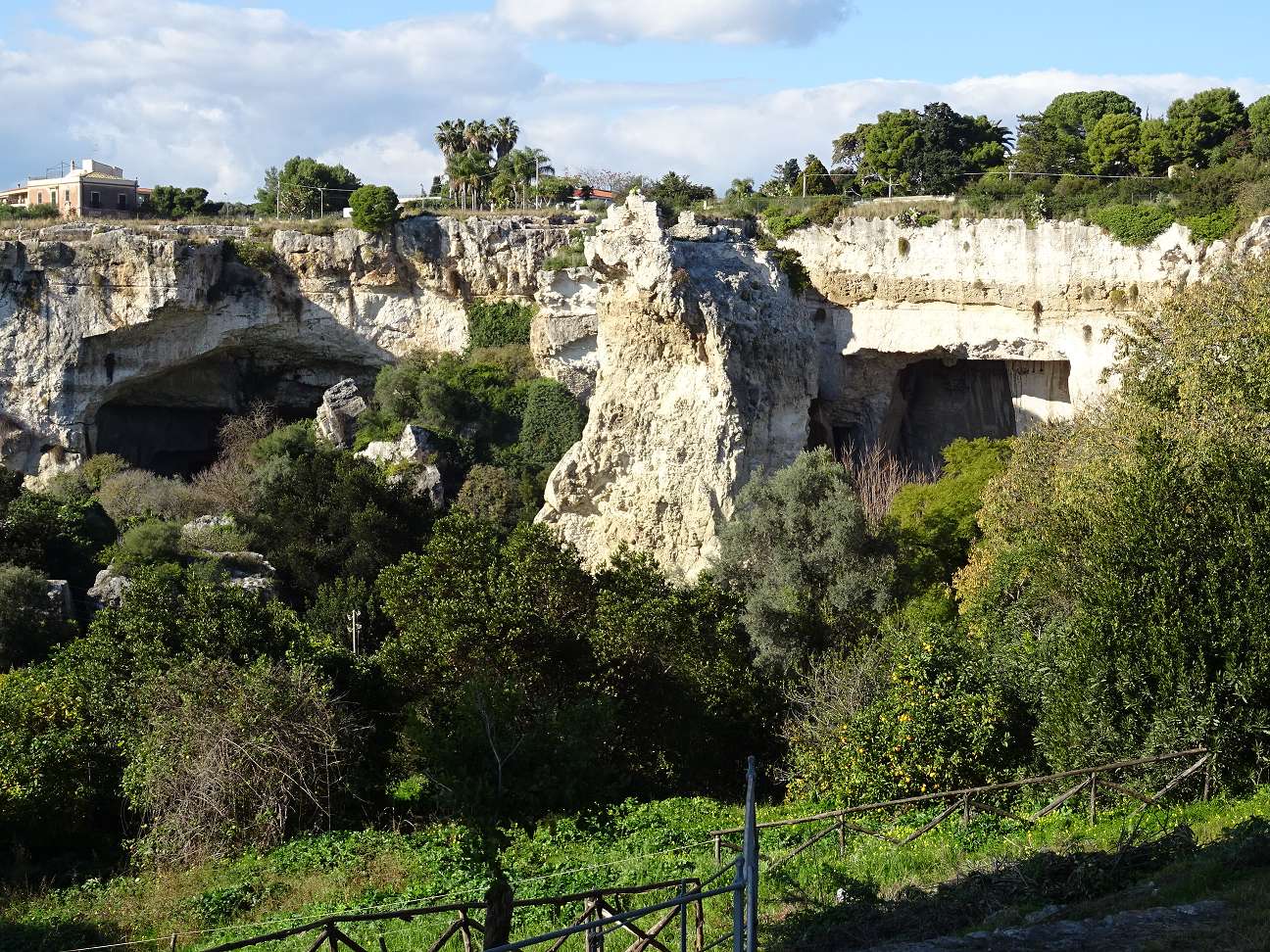 Siracusa wurde 734 v.Chr. von den Griechen gegründet und galt bis 212 v.Chr. als der Nabel der griechischen Welt. Leider war es keine sehr lebenswerte Zeit, denn der Stadtstaat der Antike wurde von Tyrannen regiert. Als dann die Römer kamen, belagerten sie Siracusa zwei Jahre lang und nahmen sie anschließend ein. Der Sage nach soll dabei einer der römischen Soldaten den berühmten Mathematiker Archimedes erschlagen haben. Dies war der vorläufige Untergang der Stadt. Im Archäologischen Park „Neapolis“ wurde ein Großteil des Zentrums des antiken Siracusa ausgegraben. Mit einem Ticket sind das römische Amphitheater, das griechische Theater, das „Ohr des Dionysus“ (eine 60m lange Höhle mit hervorragender Akustik) und weitere Sehenswürdigkeiten zu bestaunen. Ein Großteil des Geländes sieht wie ein Steinbruch aus. Da wir die meiste Zeit des Tages in der Altstadt verbrachten und dann auch noch zu den Salinen wollten, ließen wir den Besuch des Archäologieparks aus. Wir versuchten noch, am oberen Ende des Geländes einen Blick auf die Theater zu erhaschen, aber das war nichts.