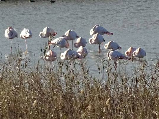 Nach dem Stadtbummel in Siracusa fuhren wir noch zur Saline von Siracusa, im Westen des Porto Grande, wie die Bucht südlich von Siracusa heißt. Der Weg ist ausgeschildert, aber das letzte Stück des Weges muss man zu Fuß gehen, denn die Saline ist ein Naturpark. Auf der rechten Seite kann man über die Bucht hinweg die lange Skyline von Siracusa sehen. Links liegen die Wasserbecken der Saline, die heutzutage sich selbst überlassen werden. Wir hatten sogar Glück und sahen in der Ferne Flamingos. Die meisten von ihnen schliefen gerade, nur wenige stakten auf Nahrungssuche durch das flache Wasser.