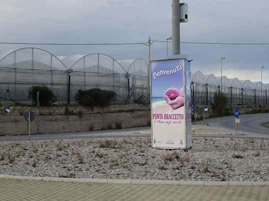 Umrahmt wird Punta Braccetto von Quadratkilometern Gewächshausfläche. In den folienüberdachten Konstruktionen wachsen Tomaten, Auberginen, Paprika und Gurken, mengenmäßig in dieser Reihenfolge. Unterbezahlte Arbeitskräfte und Schwarzarbeiter schuften dafür, dass der Rest Europas und vielleicht weiter weg, Obst und Gemüse das ganze Jahr über kaufen kann. Auf den sizilianischen Märkten kostet so ziemlich alles, was angeboten wird, 1,-€ das Kilo oder zum Teil weniger.