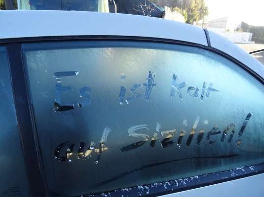Für ein paar Wochen werden wir auf dem Campingplatz „Baia dei Coralli“ sein, denn vor Februar brauchen wir wohl unsere Rundfahrt Richtung Westen und Norden der Insel Sizilien nicht fortzusetzen. Wir hatten gehofft, dass es nicht ganz so kalt hier im Süden sein würde, aber wir wurden eines besseren belehrt. Die Einheimischen meinten schon, dass es bisher noch nie so kalt war. In der vorletzten Nacht hatte der Wetterbericht von 3 Grad plus gesprochen, doch es fror. Wir hatten also Minustemperaturen. Am nächsten Vormittag hatte es sogar wenige Kilometer von der Küste entfernt und auf 100 Metern Höhe geschneit. Da ließen sogar die Sizilianer alles stehen und liegen und zückten ihre Fotoapparate. Die Tagestemperaturen lagen bei 6-8 Grad. Das waren jetzt wohl die Tiefstwerte. Ab jetzt geht es hoffentlich wieder bergauf und der Mittelmeer-Frühling steht vor der Türe.