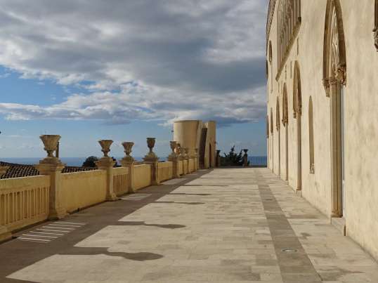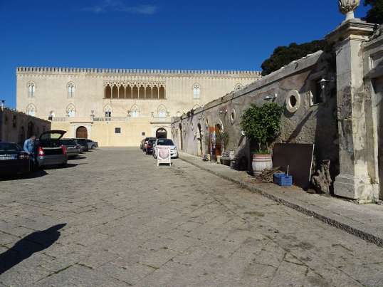Vom Park aus führt eine Treppe auf die Terrasse am Schloss, die auf beiden Seiten von kleinen Türmen begrenzt wird, von denen einer eine Glocke aus Catania trägt. Von der Terrasse aus blickt man auf die Nebengebäude, die rechts und links an der auf das Schloss zulaufenden Straße angeordnet sind. Einige davon sind verfallen, in anderen sind Souvenirgeschäfte und Pizzerien untergebracht.